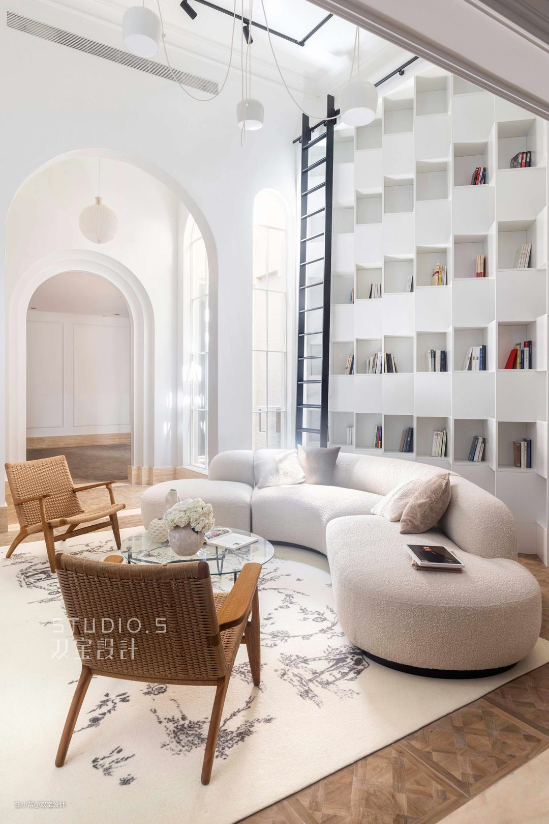 以素雅色系聚合的一个温婉之境,兼备收纳、装饰、阅读与休闲功能的一方天地。设计师将原本全通透的空间进行细节分区,通过对天井的设计、软硬装的合理搭配、动线的清晰规划,满足屋主的生活方式与喜欢阅读的需求,打造一个修身养性的起居空间,营造温馨安逸的居家氛围。
