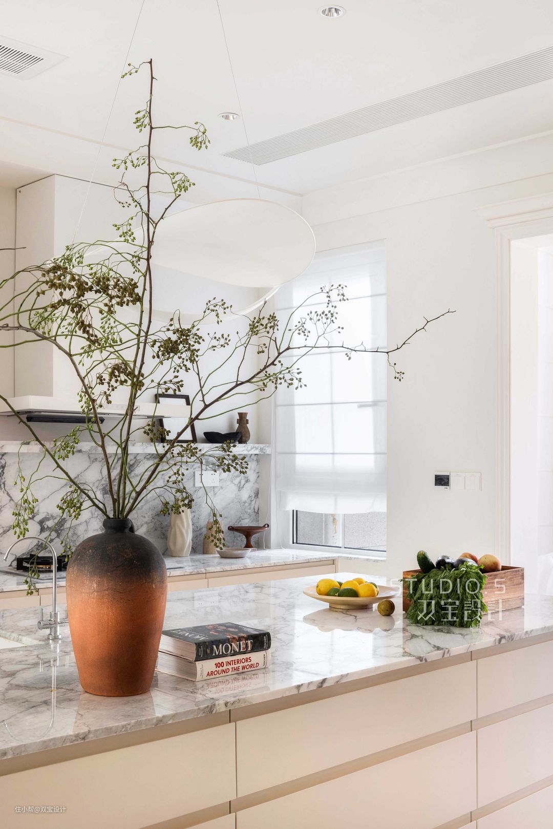 中西厨的结合增加生活便捷性的同时也能呈现生活的仪式感,中岛台坐落于客厅到餐厅的动线上,集多功能于一身的同时又给人美好视觉体验。石材选用大花白大理石,凸显空间质感。烟火人间亦可诗可画,把柴米油盐的琐碎日常过成一部浪漫的法式电影,这便是生活的艺术。哑光暖调裸色作为空间主色调,营造浪漫舒适的空间氛围。