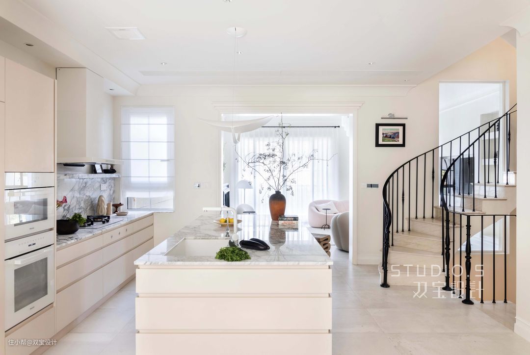 中西厨的结合增加生活便捷性的同时也能呈现生活的仪式感,中岛台坐落于客厅到餐厅的动线上,集多功能于一身的同时又给人美好视觉体验。石材选用大花白大理石,凸显空间质感。烟火人间亦可诗可画,把柴米油盐的琐碎日常过成一部浪漫的法式电影,这便是生活的艺术。哑光暖调裸色作为空间主色调,营造浪漫舒适的空间氛围。