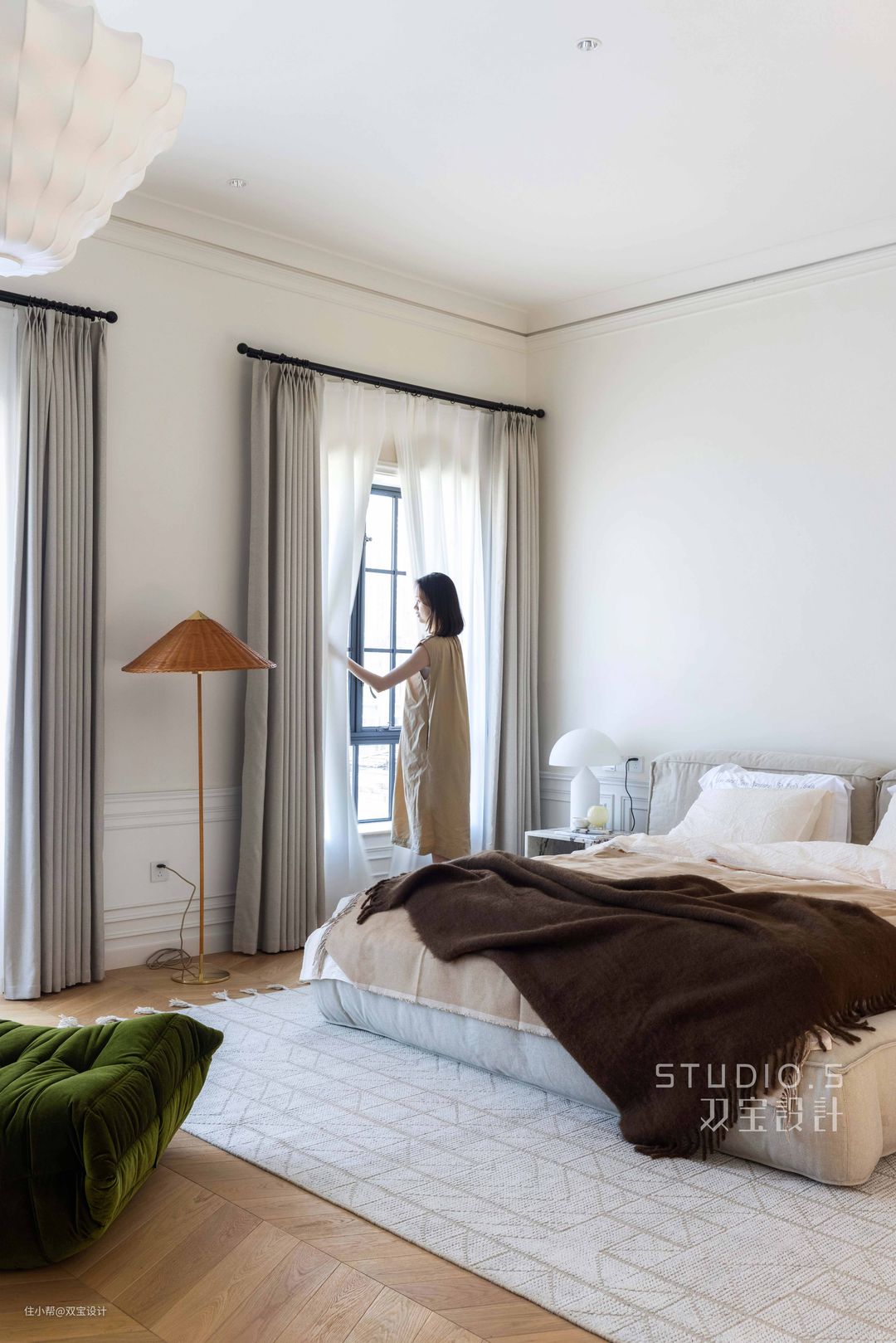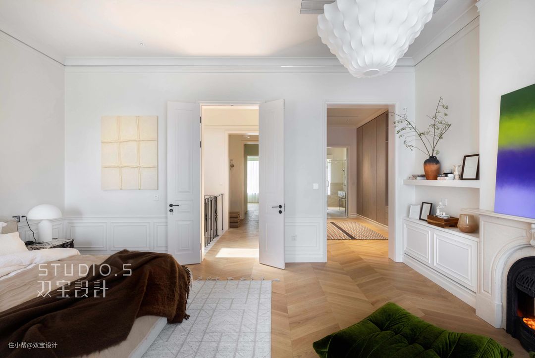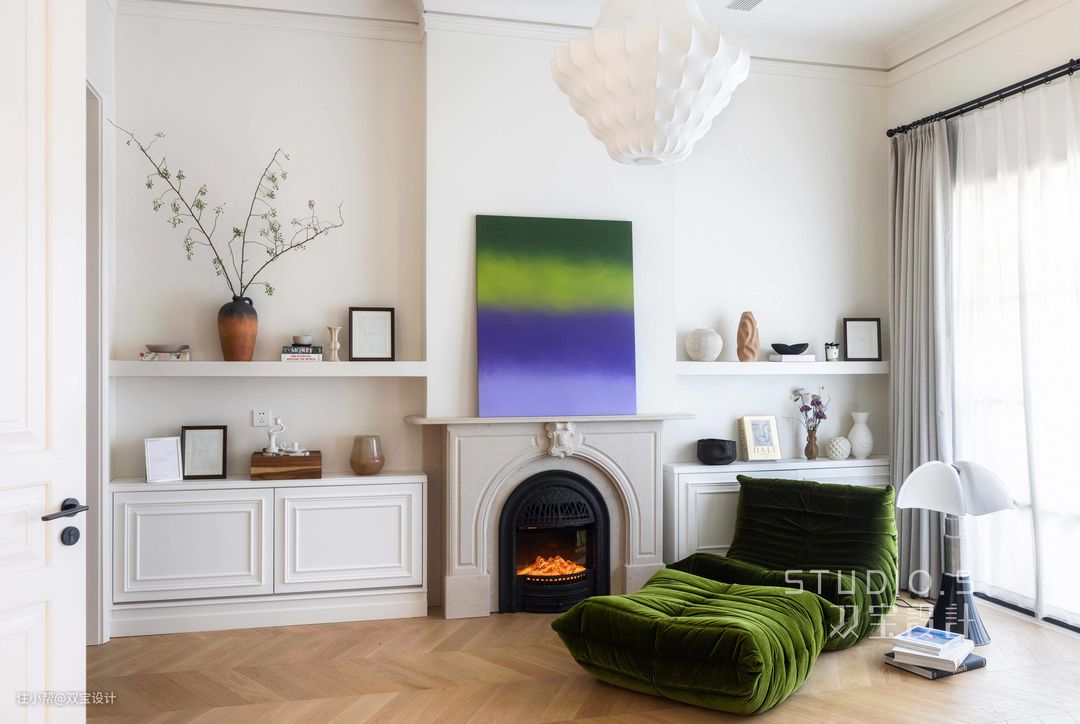 鱼骨拼木地板延伸至室内,卧室延续公共区域的沙灰白主调,饰以葡萄牙米黄大理石壁炉,营造法式的优雅浪漫。绿色Ligne Roset Togo沙发与Liveart装饰画运用大胆撞色手法诉说时间的味道,壁炉两侧采用单层壁龛+装饰柜,壁龛上每一个小物件都拥有与屋主专属的小故事,目睹屋主过去生活中的点点滴滴,也将见证屋主幸福的未来。