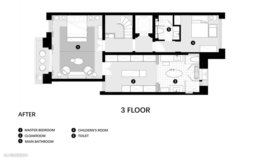 卧室原户型格局方正,但面积较小。设计师将整个三楼解构重组成一个空间大、功能齐全的主卧套房和一个小套房。优化布局后,主卧室的休息室-衣帽间-卫浴三者动线顺畅,贴合屋主洗漱-更衣-休憩的生活动线,让屋主最直观的居住体验更加良好。