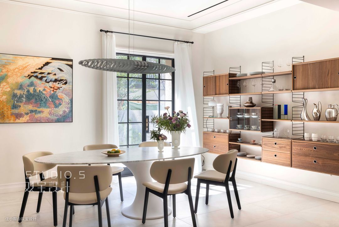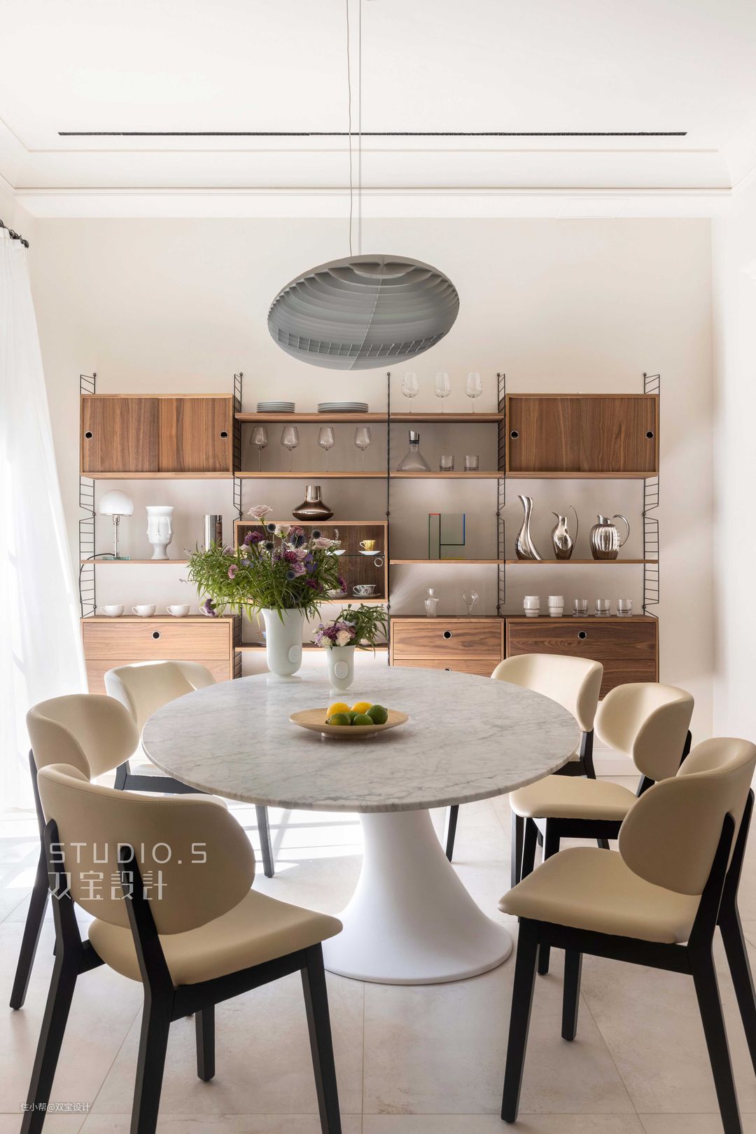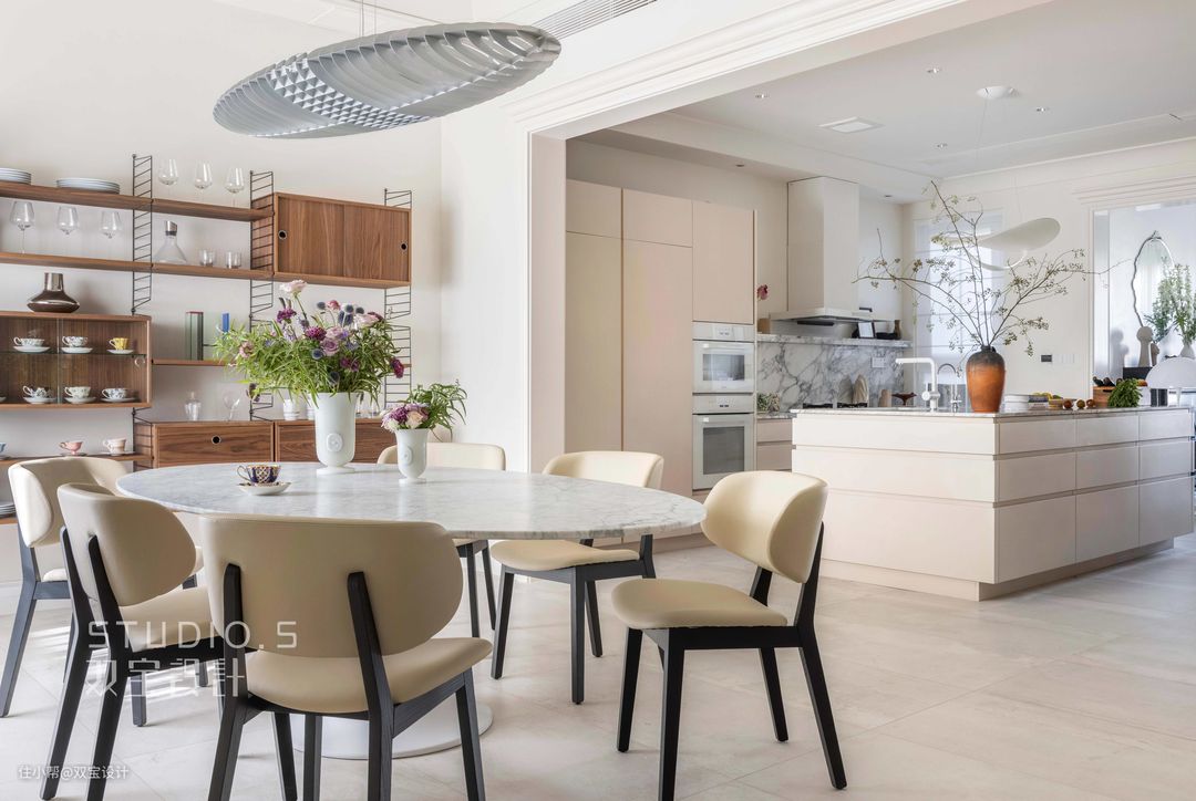 简而不凡的餐厅坐落于中西厨一侧,Cattelan Italia餐桌优雅地处于餐厅中心,整体就像一件雕塑品,让空间充满艺术感,椭圆形的桌面与椭圆形的吊灯相呼应,几何造型的和谐丰富了空间的秩序感。