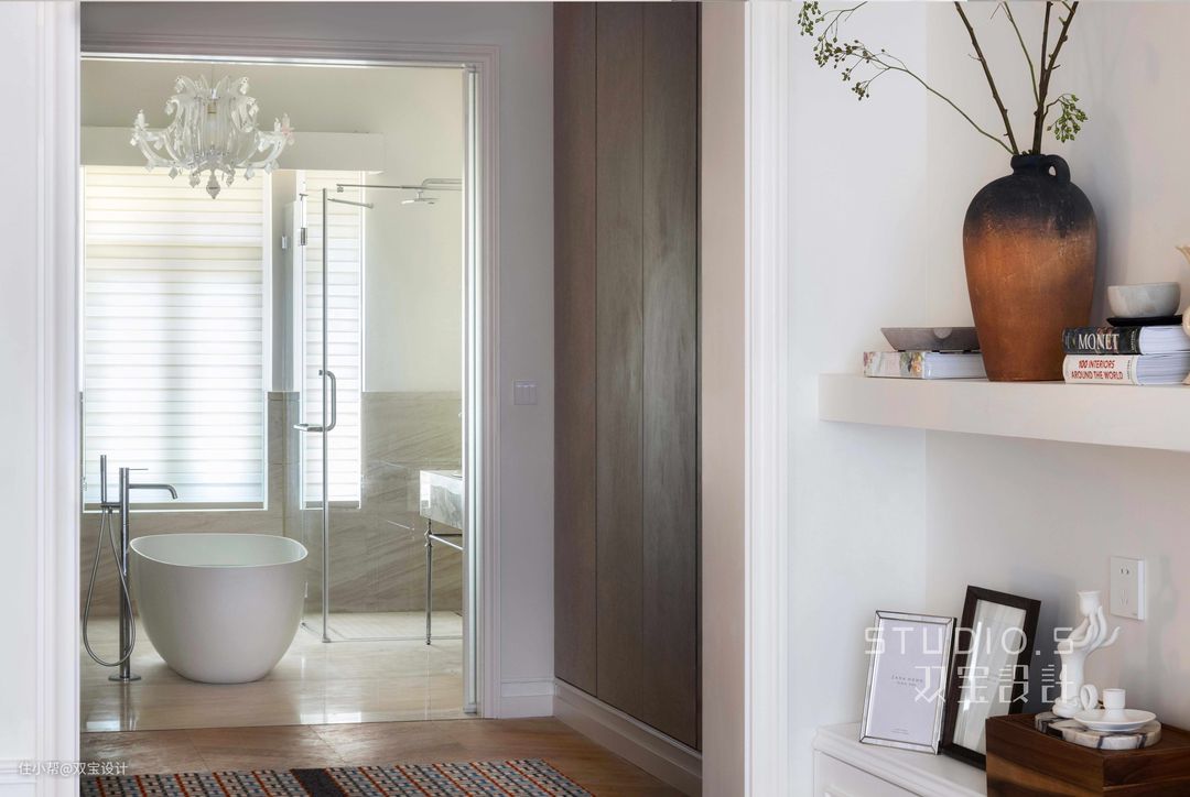 设计师优化整个主卧套房布局的同时也没有忽视对小空间的塑造。卫生间采用三分离与双台盆的设计,用玻璃隔断作为分隔,满足男女业主不同的需求,布局合理又整洁美观。湿区淋浴、干区泡澡,超大浴缸满足天天泡澡的愿望,舒缓一整天工作带来的疲惫。