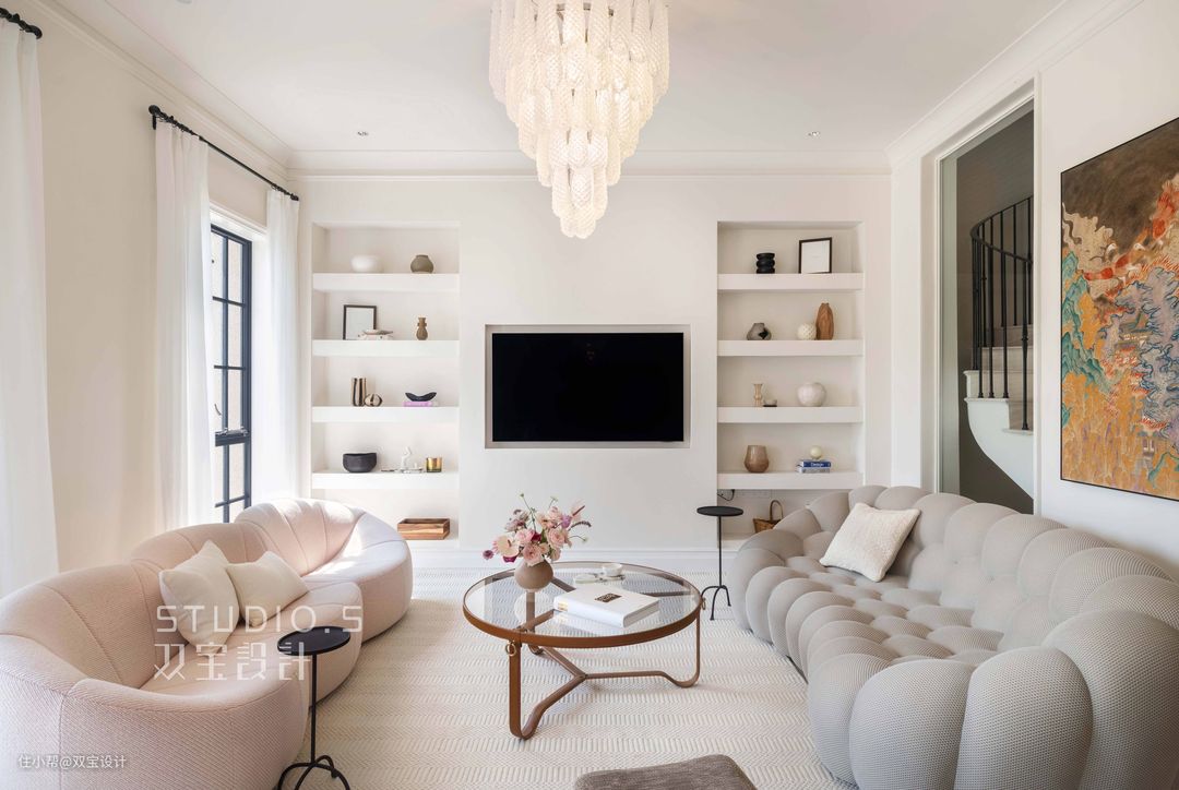 Murano中古水晶灯肆意挥洒暖光在屋主与亲友身上,共览纪录片、品电影也不失为一件幸福的事,温馨的环境让人与人之间的沟通更加亲密与自然。墙面做同色系壁龛置物架,节省空间又赋予多功能使用性,内嵌式设计的延伸性舒缓空间压迫感,又有衬托陈列品魅力的装饰功能,暗藏灯带的细节增加空间层次感。