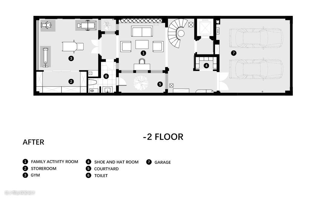 改造亮点: 1.在原本的户型中,三层地面建筑,被一处天井沉闷切割。无论是空间的纵深感还是光线明暗都被天井堵塞、压缩。为了改善这一境况,设计师打通了天井的四壁,以大面积的落地窗将天井围绕。三个天井为各层楼带来了自然光,光影赋予空间灵动感。 2.将传统楼梯改造成具有动人曲线美的法式旋转楼梯,开放式客厅的多重动线设置使得空间更畅通与灵动。 3.餐厨区拥有洄游动线,中岛台处于餐厅通往客厅的动线上,造就了视觉上的风景,也建立了空间的连接感。 4.主卧空间解构重建为卧室+衣帽间+三分离卫生间的套房,增加卧室的空间且保证私密性,步入式衣帽间、淋浴间干湿分离保证使用的舒适感。