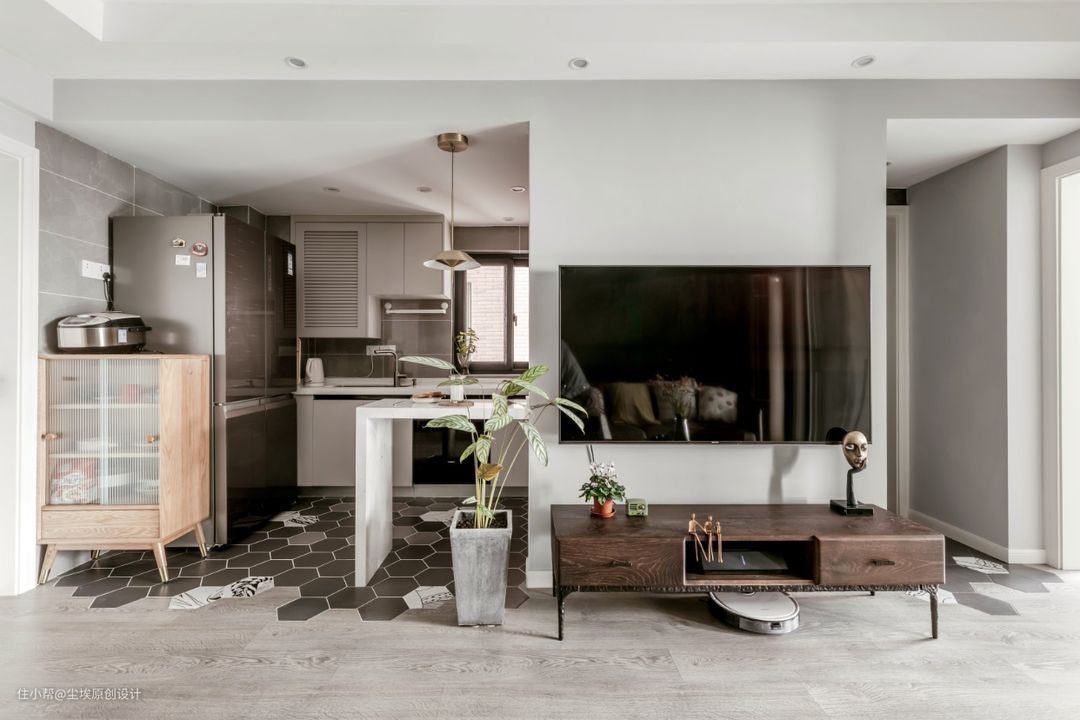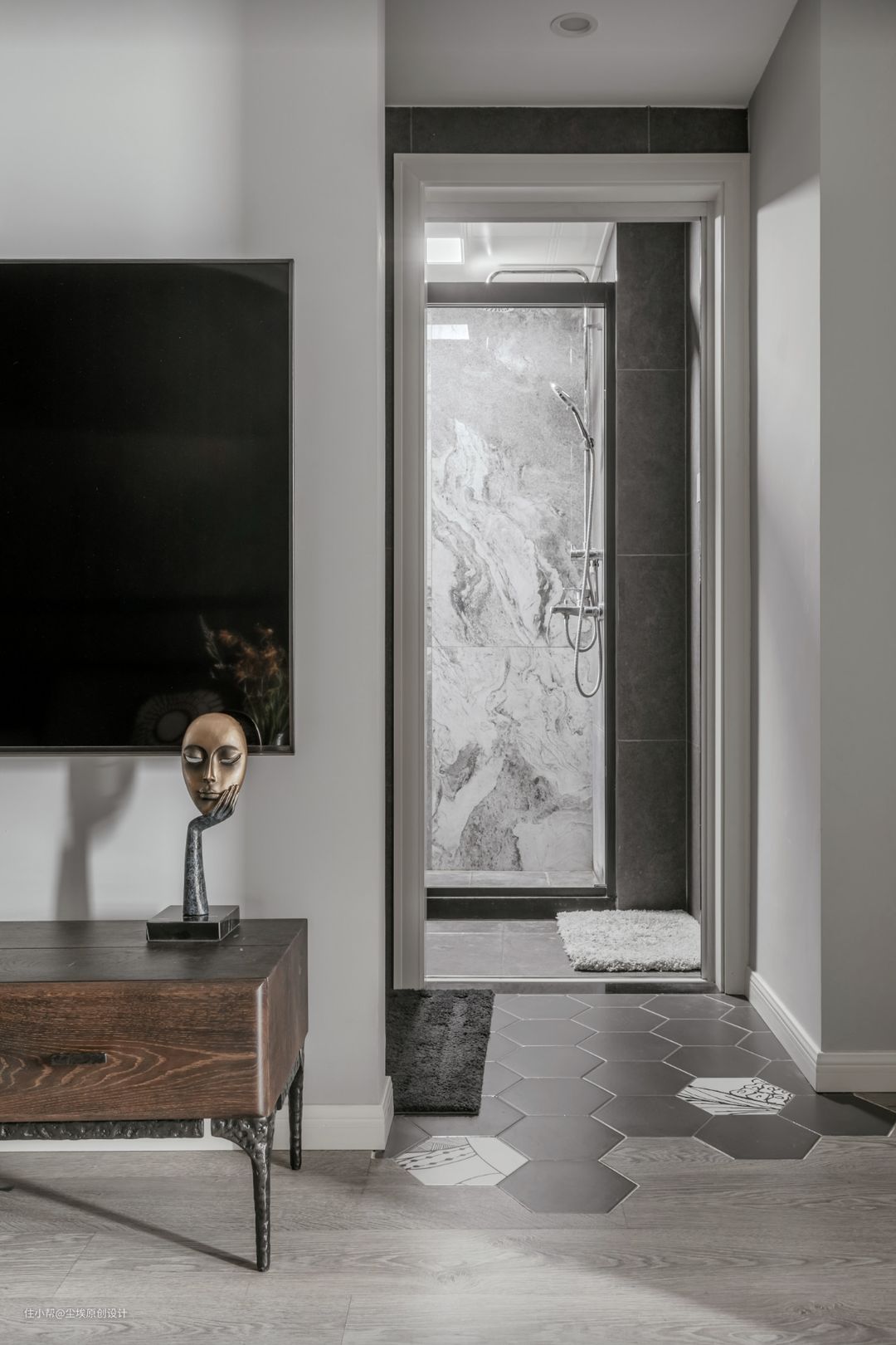 电视背景墙后面这一侧是卫生间干区。 卫生间的干区还有主卧的门也在这里,非常的不规则。所以就和厨房一样用了六角砖。 摆件是巷子戏法的~#六角砖 #卫生间 #干湿分离