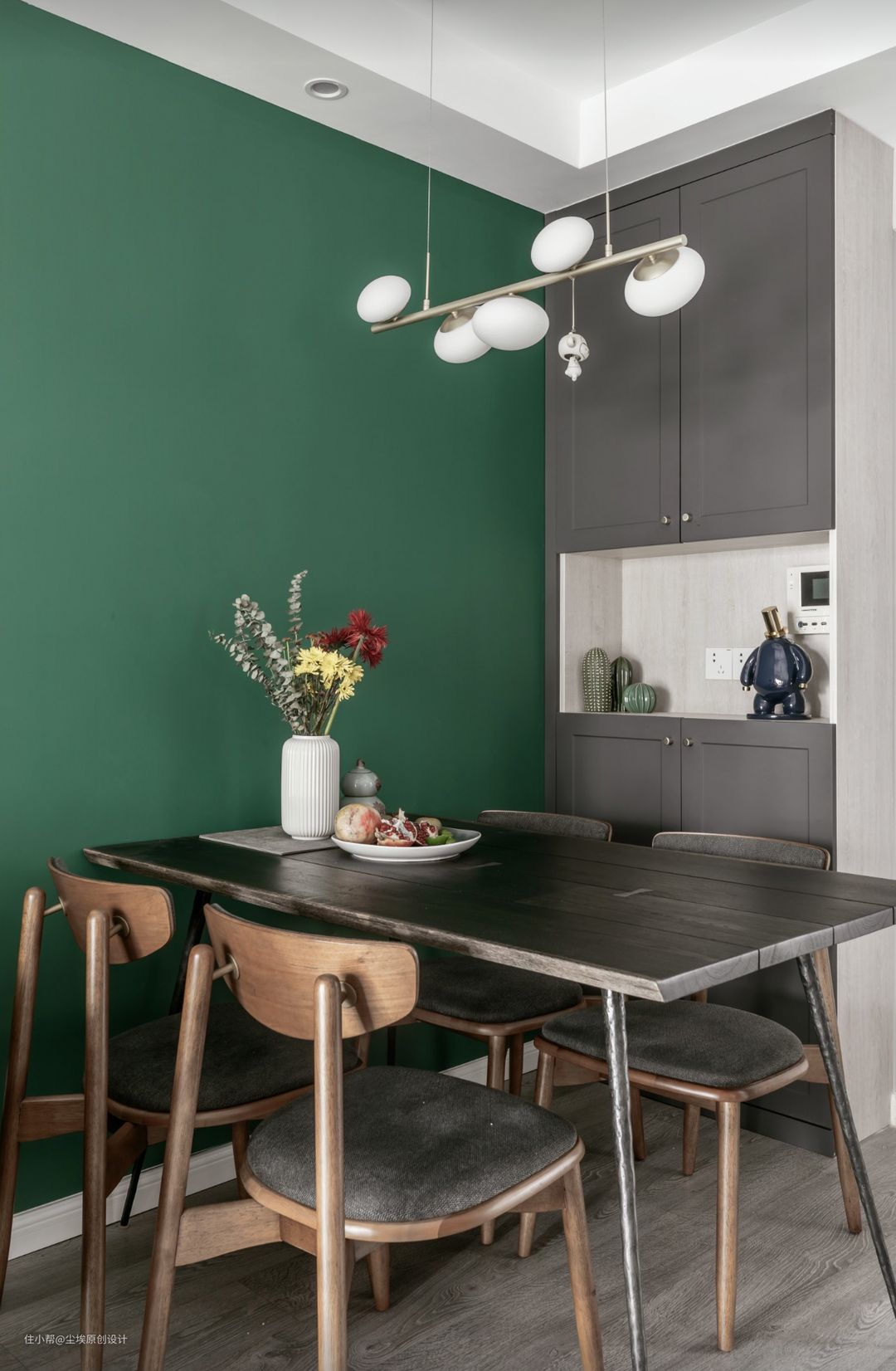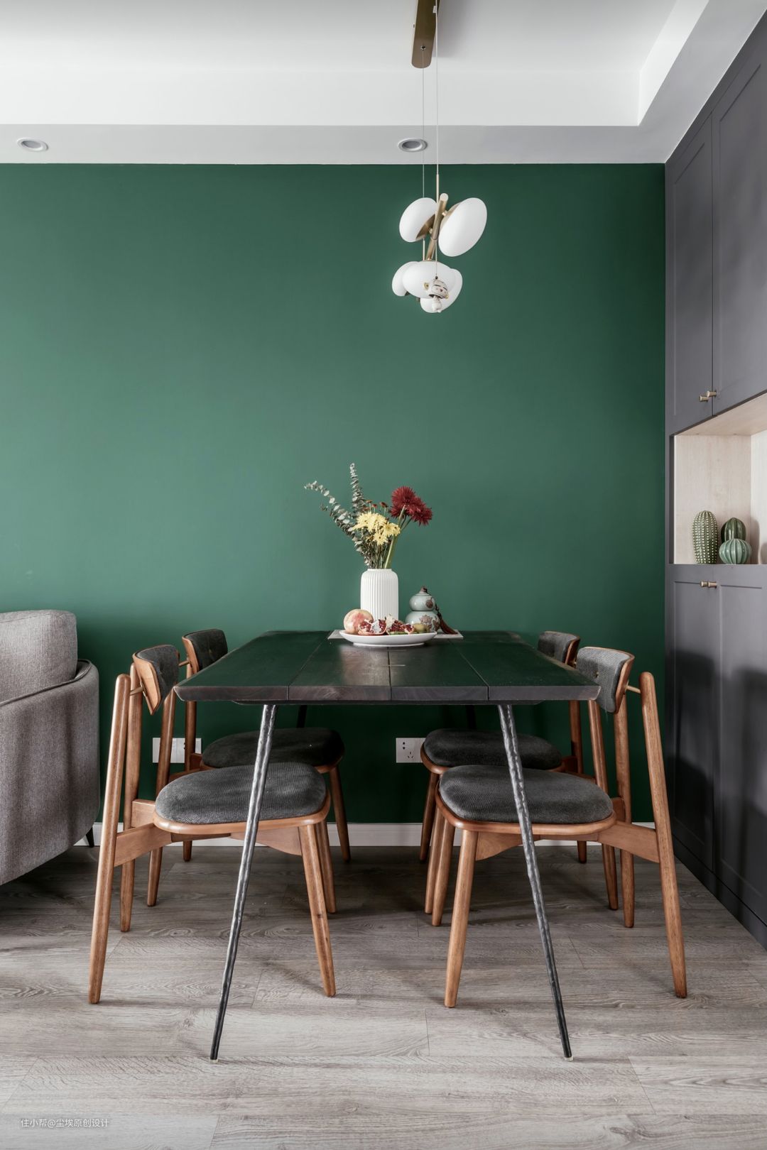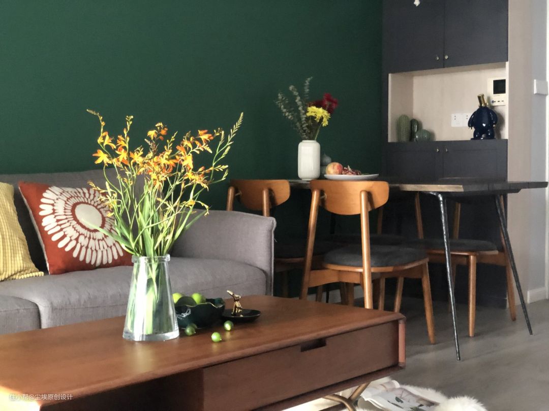 墨绿色涂料配上北欧表情的沙发和餐桌