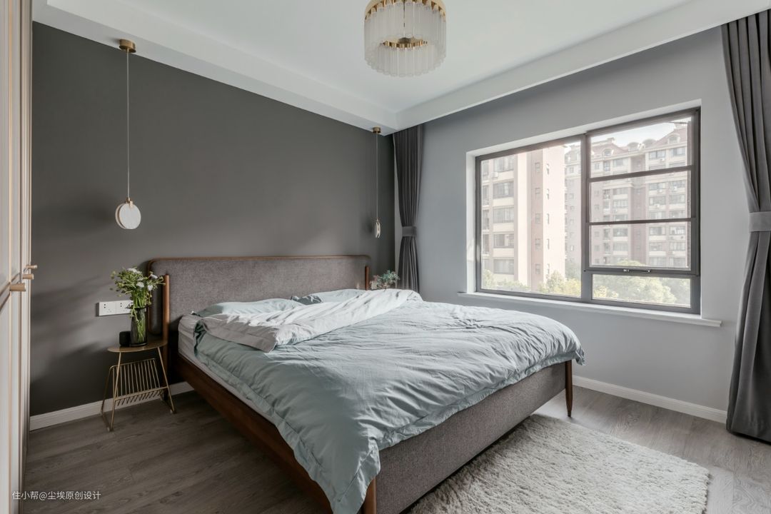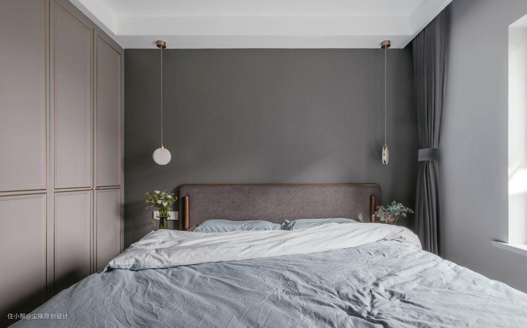 深灰色涂料配上灰色木床,色调统一。金属吊灯丰富一下颜色。 窗帘用的也是深灰色的绒布料。还有简易的金属床头柜作为搭配~ #深灰色 #高级灰 #床头背景墙 #床