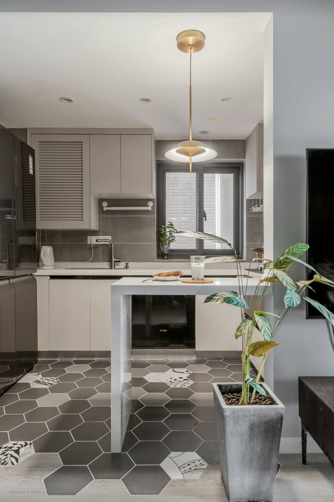 厨房是做的开放式的,但是业主平时做菜也爱放辣,所以好的抽油烟机少不了的,当时业主就买了这款方太的最新款,不得不说颜值还是很可以的。 墙面用了灰色砖和地板的六角砖也是相互呼应的。#六角砖 #开放式厨房 #方太