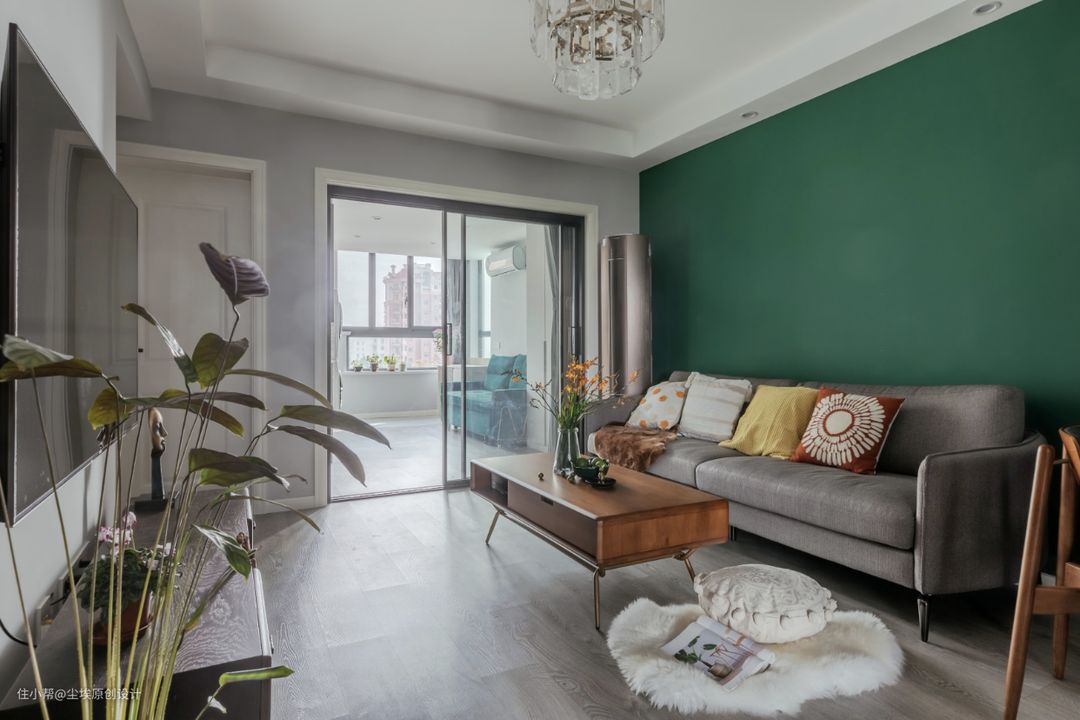 客厅虽然没有阳台但是一点也不影响深色涂料的效果,墨绿色涂料点亮了整个家。选了一款北欧表情的灰色系沙发,简单也好看的。 为了采光旁边的书房做了透明的玻璃移门,这样客厅就不会暗了。 #墨绿色 #沙发背景墙 #北欧表情
