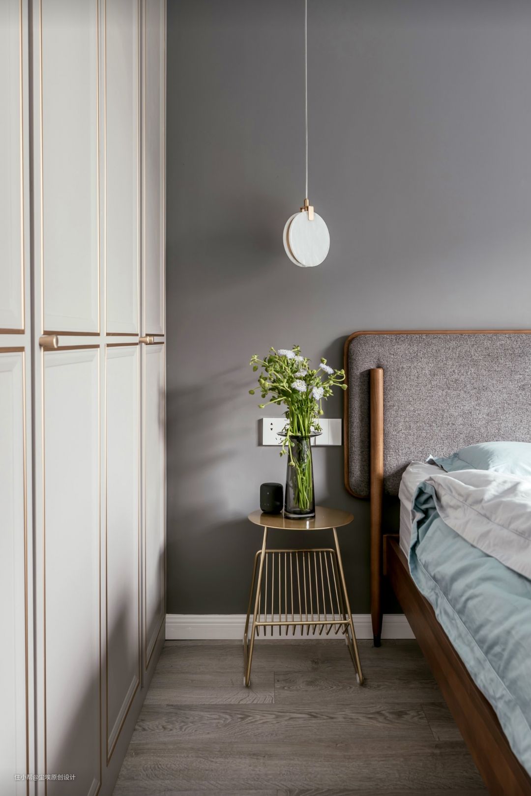 卧室床头吊灯用的大理石卡金属线条,衣柜也是门板卡金属线条。这些金属线条既不浮夸又不宣兵夺主。家里多了一分精致可爱~ #衣柜 #卧室 #吊灯