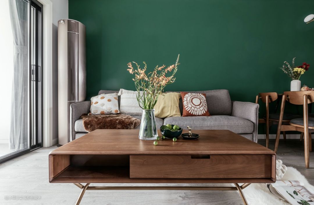 沙发背景墙刷了都芳的墨绿色涂料。配上北欧表情的沙发和餐桌,很赞呢。 一早就看中了北欧表情的这款餐桌了,看好又特别,和墨绿色也很搭。茶几也是北欧表情的。 #北欧表情 #墨绿色 #沙发背景墙