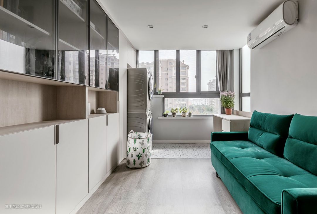 书柜上面做的玻璃门板,中间镂空,下柜做的模压门板~ 房子格局特殊,书房带的阳台,因此就把洗衣机烘干机放到了书房阳台,洗衣机对面是书桌,偶尔可以在这里学习办公。 墨绿色的沙发床可甜可盐~ #沙发床 #书房 #书架 #玻璃门板书柜