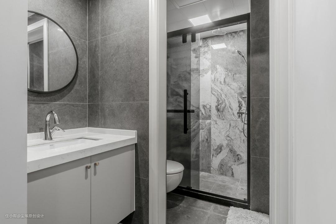 卫生间只用了两款砖,一款灰色水泥砖,和大理石纹路的大板砖。 台盆区域用了和橱柜一样的门板,上面放一个简单的圆境。里面用的黑色淋浴房,和大板砖很搭。 #干湿分离 #大板砖 #大理石纹路