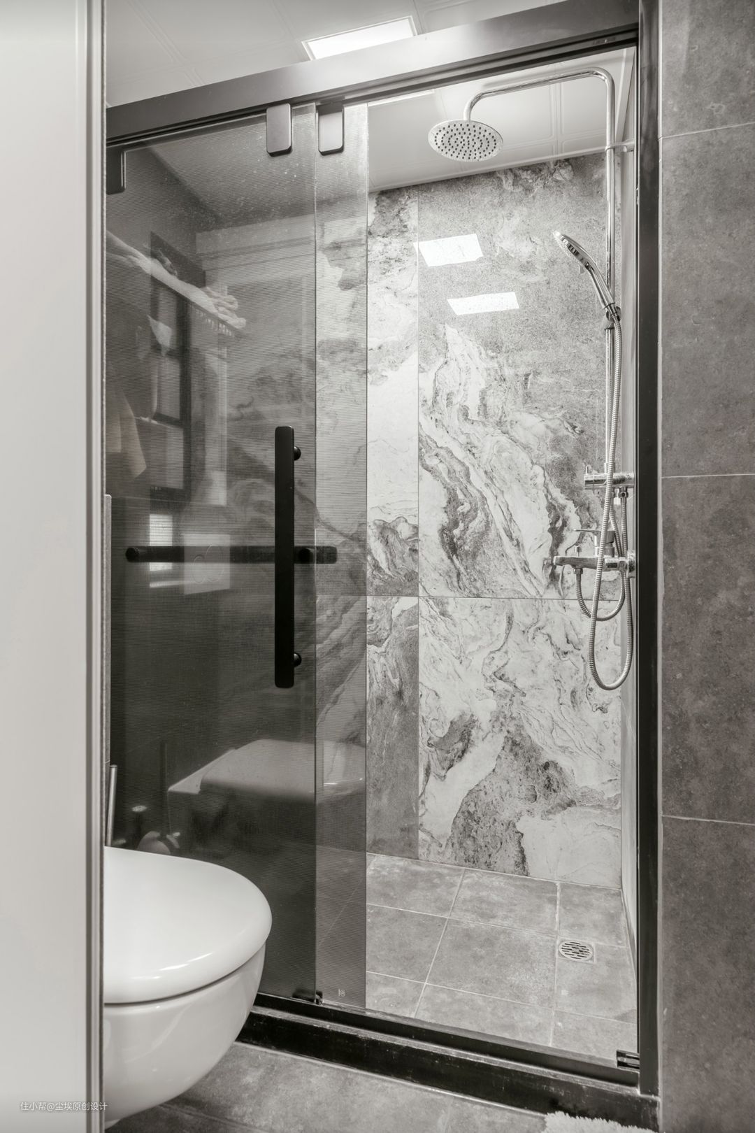 卫生间淋浴房用了深灰色大理石纹路的大板砖太赞了👍。大砖就是高端大气上档次