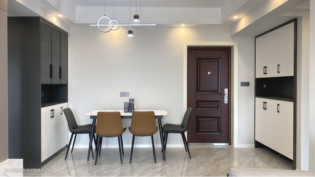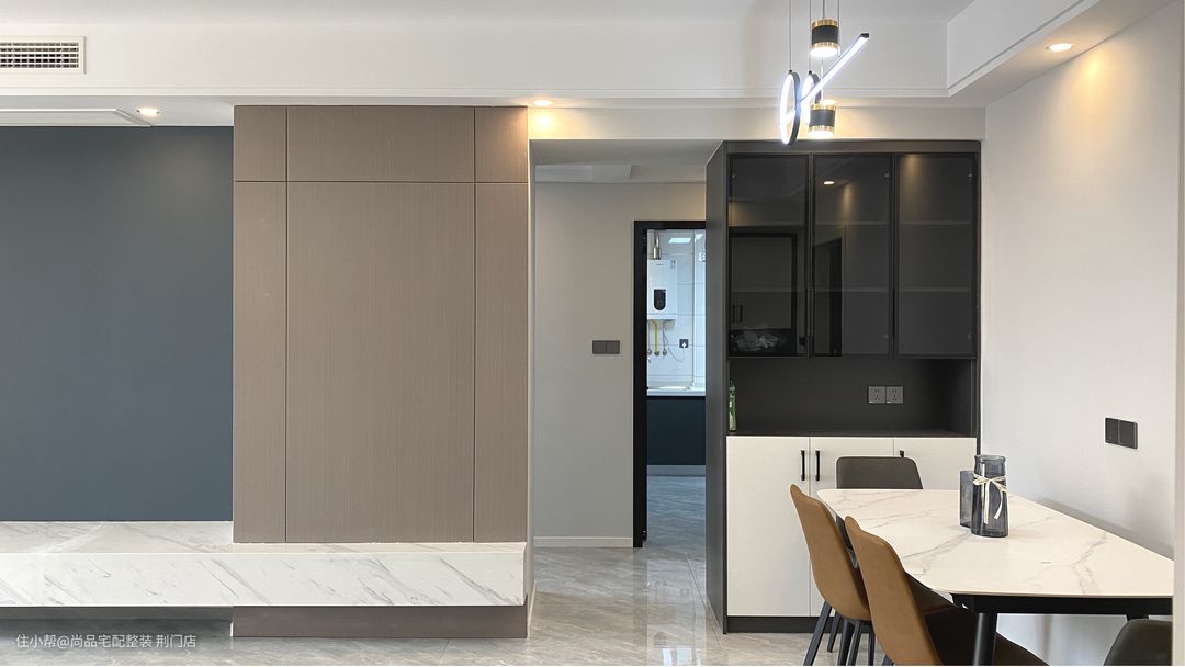原厨房与餐厅合二为一,这里刚好又是入户区域,进门的视野非常开阔。餐厅的两端都做了整面到顶柜子,鞋柜、餐边柜、杂物收纳柜统统都有,日常囤货、收藏、展示需求都得到了满足。
