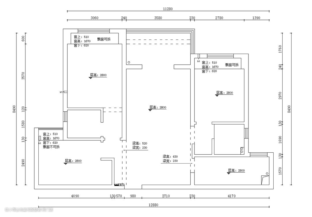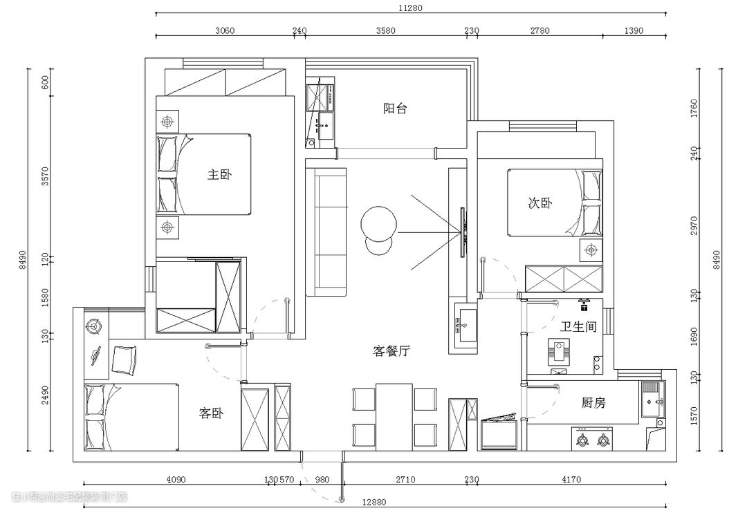 1.在原有格局基础上进行优化重组,借用墙体空间增加收纳,提高空间实用率。 2.将原厨房空间打开,将厨房内置,打造宽敞明亮的L型厨房。同时,以玻璃门作为隔断,另一侧便是宽敞通透的餐厅空间。餐厅靠墙两侧均定制了到顶收纳柜,鞋柜、餐边柜通通安排上! 3.公卫前拓,将原过道位置纳入了其中,重新划分干湿分离,增加过道收纳空间。
