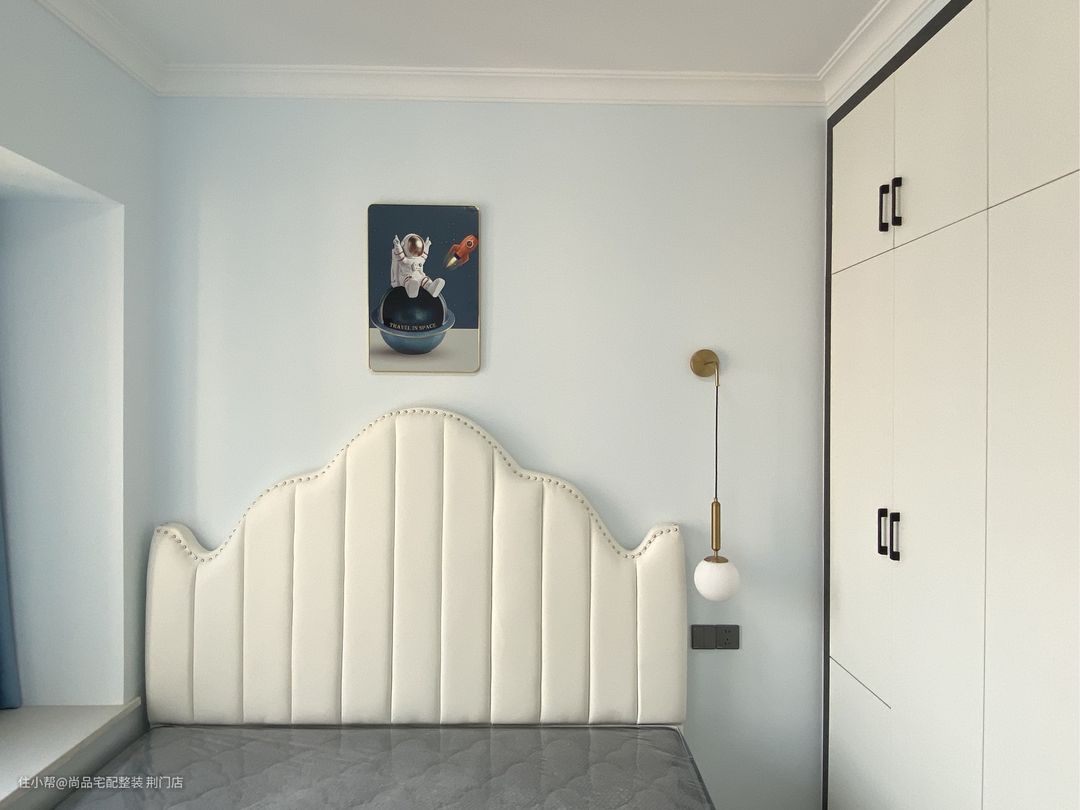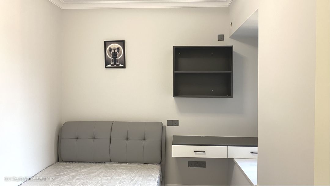 与其他房间的风格相比,次卧以一种简约而不简单的布局设计出现在了这里。靠窗的位置连接着书桌,拓宽了使用面积。连桌子上方的展示架都做好了放书的准备。