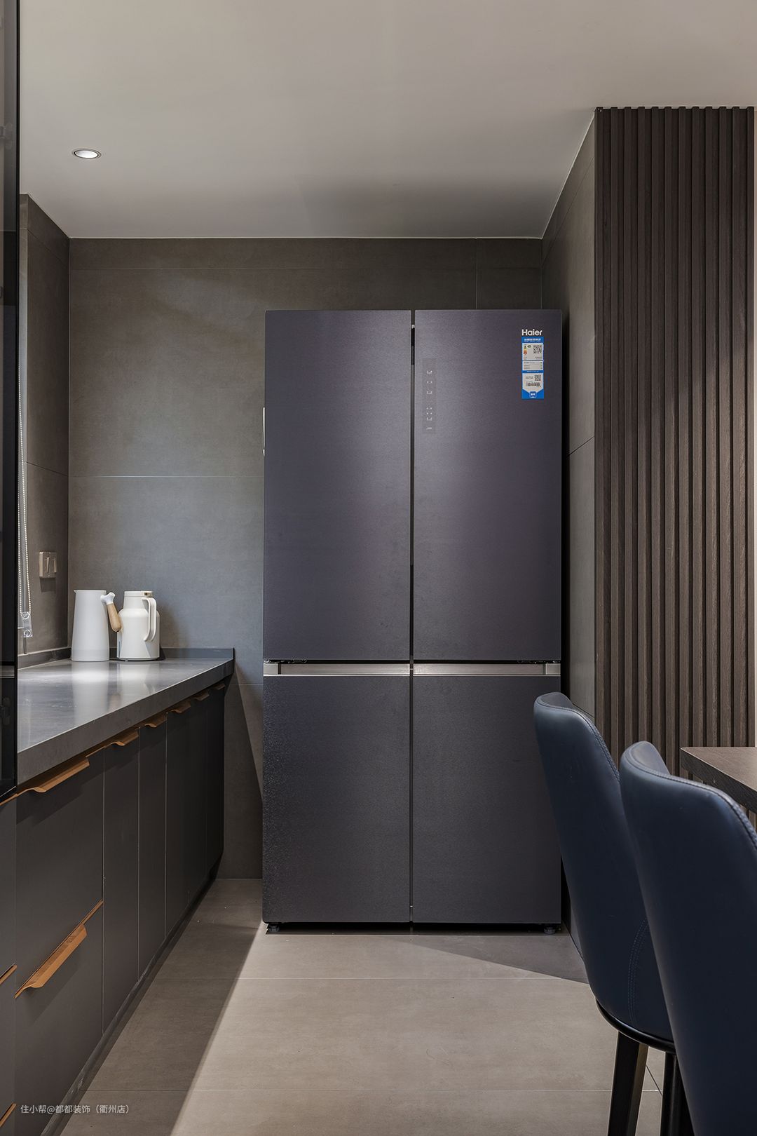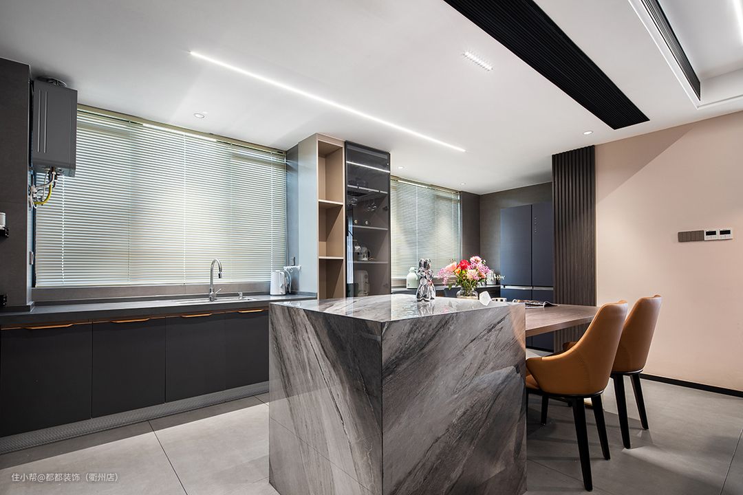 餐厅处的岩板和木质兼具了时尚和潮流感,餐桌+岛台一体化的设计对于空间的利用会更加细致,在用餐的时候,若是把电饭煲、汤煲等放在餐桌上,可能会阻碍夹菜,而放在岛台上的话,就可以非常的方便了,一体设计也能让餐桌与岛台的质感统一,让空间风格更加和谐大气。