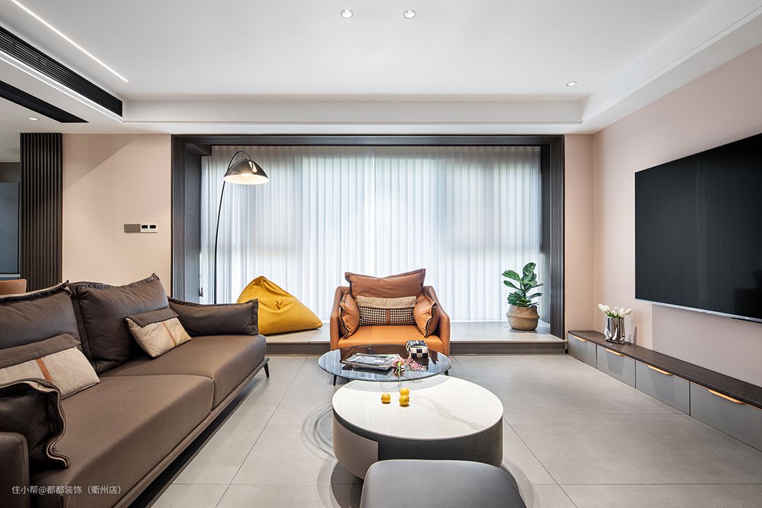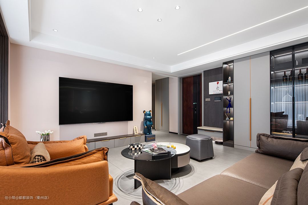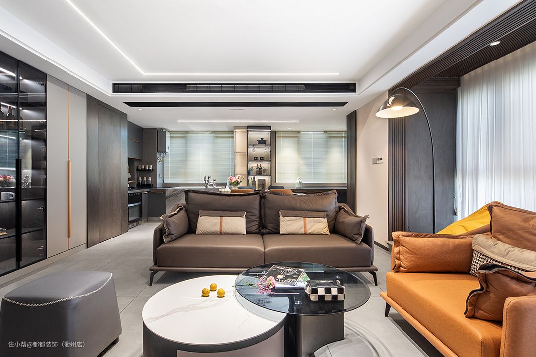 全屋都是低饱和度没有跳脱的色彩,简简单单的灰棕色调,去繁从简,搭配暖橙色皮质沙发凸显空间轻奢的质感,每一件单品都是用心搭配的,营造低调有内涵的设计风格。