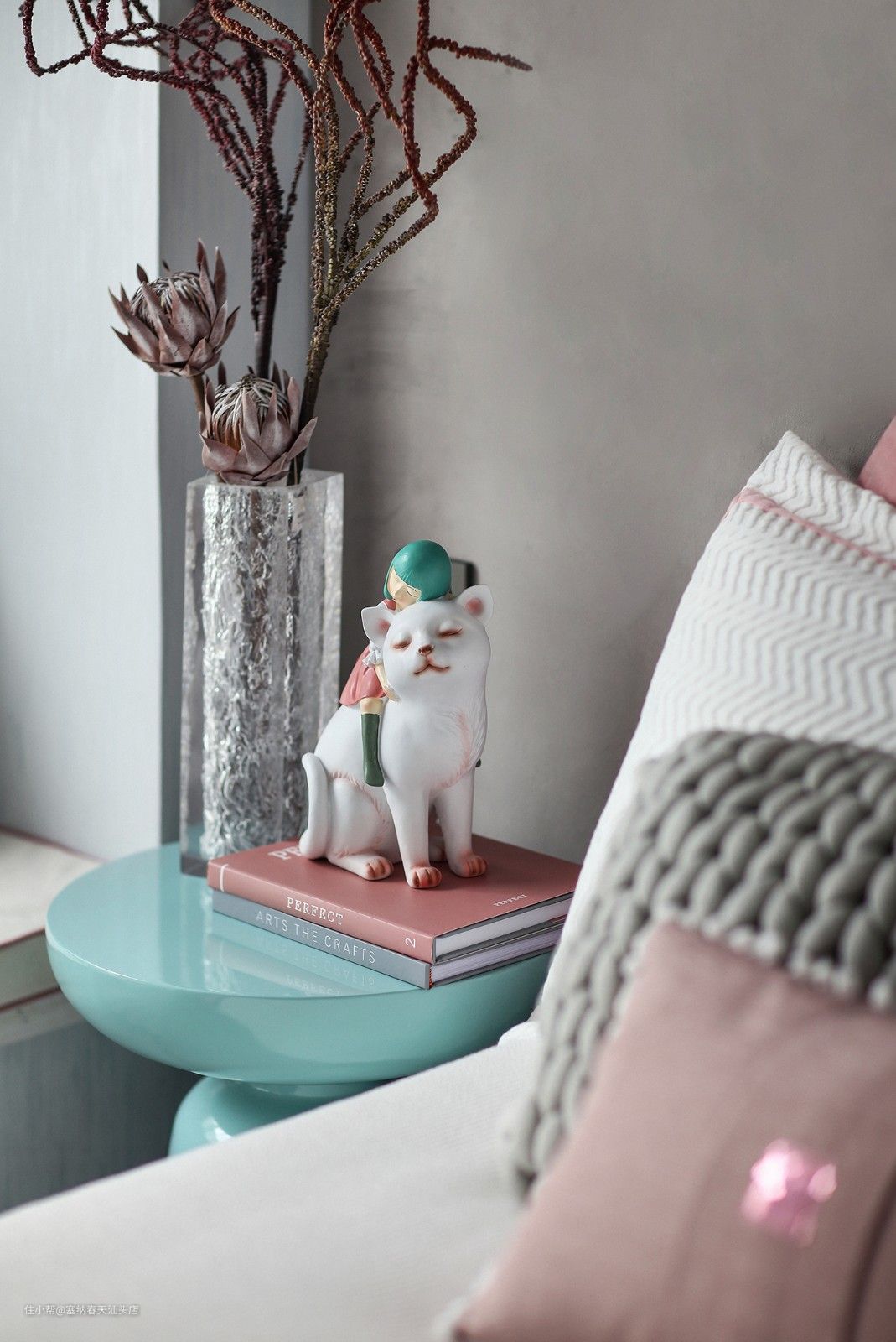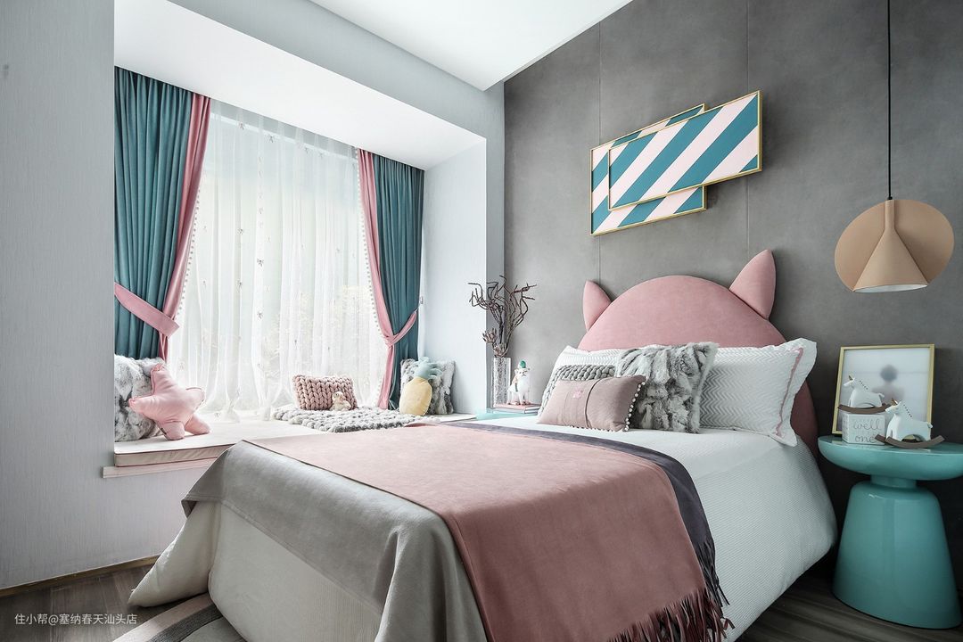 低饱和度的藕粉色与天蓝色是对童趣的完美表达,仿佛走进童梦世界,不经意之间将空间的轮廓刻画的十分深刻。