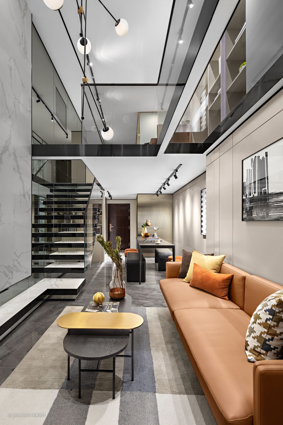 两层挑空让阳光更肆意,墙面设置镜面让空间视觉更加宽广明亮。