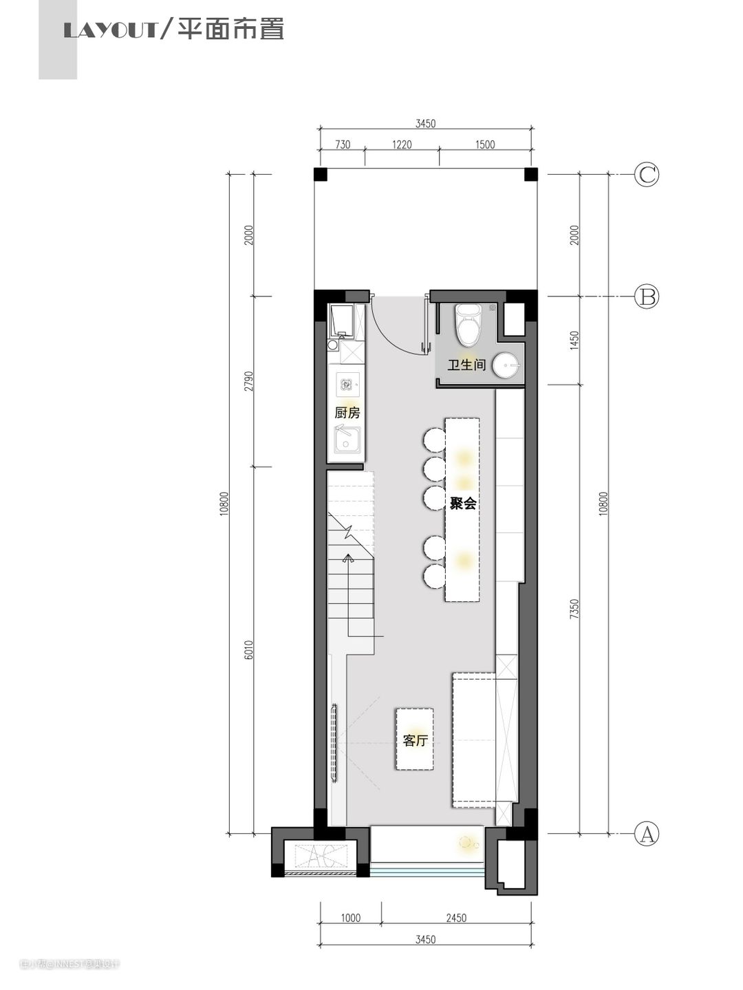 合理功能分布。厨房与浴室被安排在一侧,将管道集中在一起排布,使得下水、换气等问题能符合现代化生活的需求。