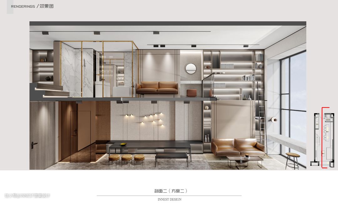 LOFT公寓内通过镶嵌在结构中的滑动门、橱柜、等结构,将室内空间重新划分。如墙壁尽可能多的做了隐蔽的收纳柜,在立面中消化了睡前醒后的基本生活需求,做到物各有位。面对入口处的空间,靠盥洗区的结构给餐厅区做视线遮挡,同时也将入口间隔开来,维持了住户的私密性。利用大量玻璃和镜面材质制造通透感和空间张力,使得空间连贯简明,同时增加节奏感。