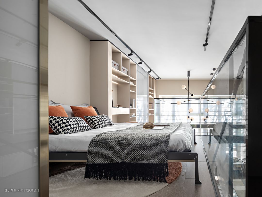 首先,我们在二层空间中运用了金属框架,金属框架中空的内部可通电线,直接将室内照明融合在整体框架中。二层在金属框架中的的洗浴间,运用了通电玻璃很好的在空间的通透感和私密性上做到一个平衡。中空的二层一条纵深的透明玻璃连廊贯穿起格局,增加了更多的收纳功能,在三维空间上最大程度地利用了空间,加强了人与人之间的粘合度。利用“可变空间”模式,将客厅变客卧,主卧变休息区等,为整个空间创造新的公共功能,重新激发区域活力。