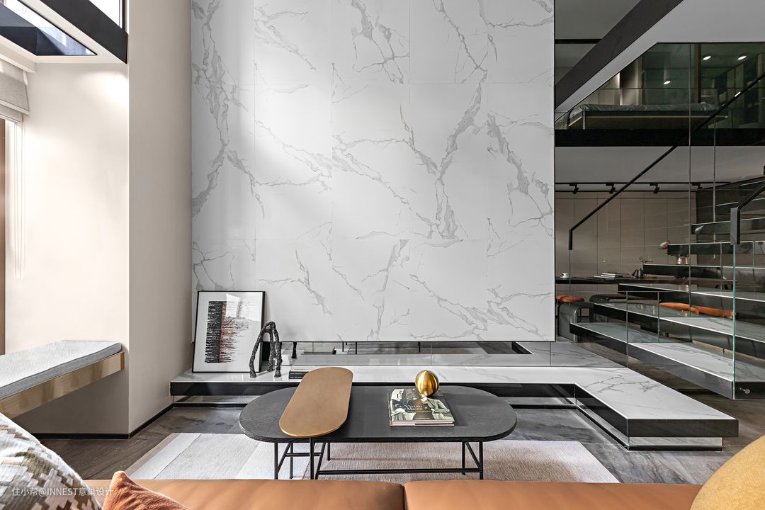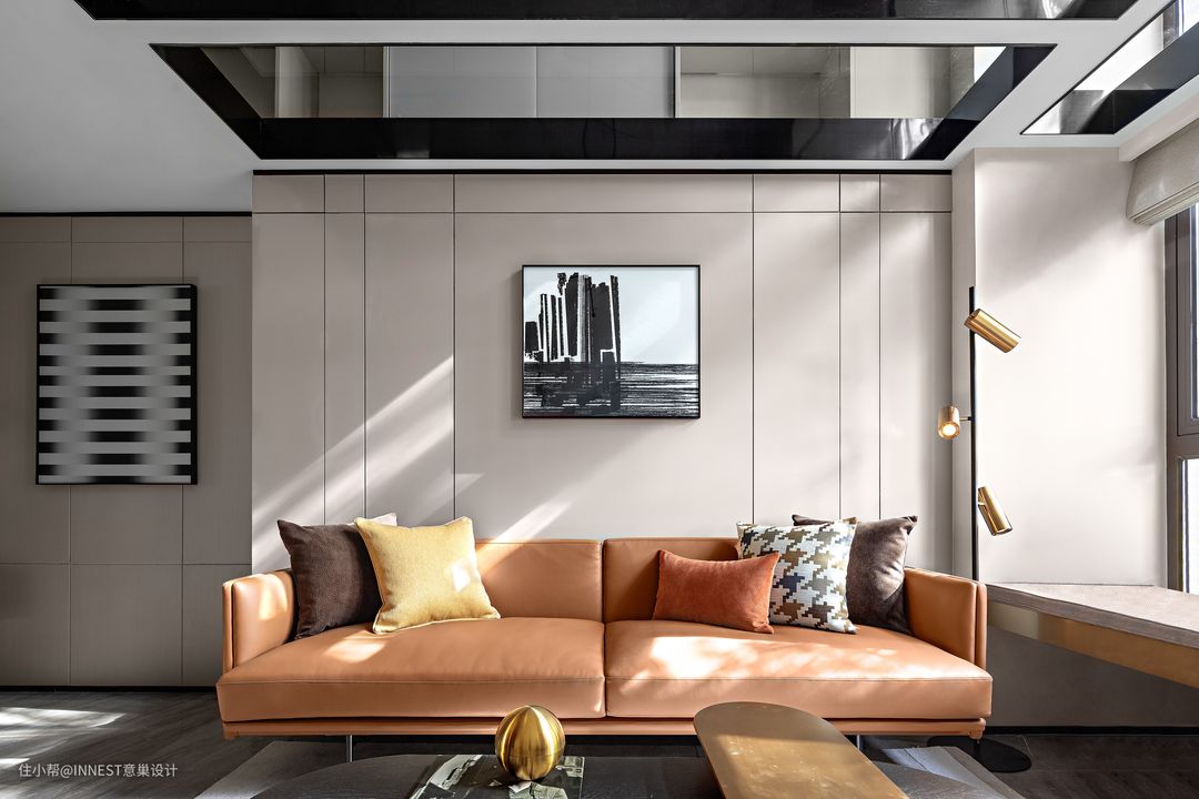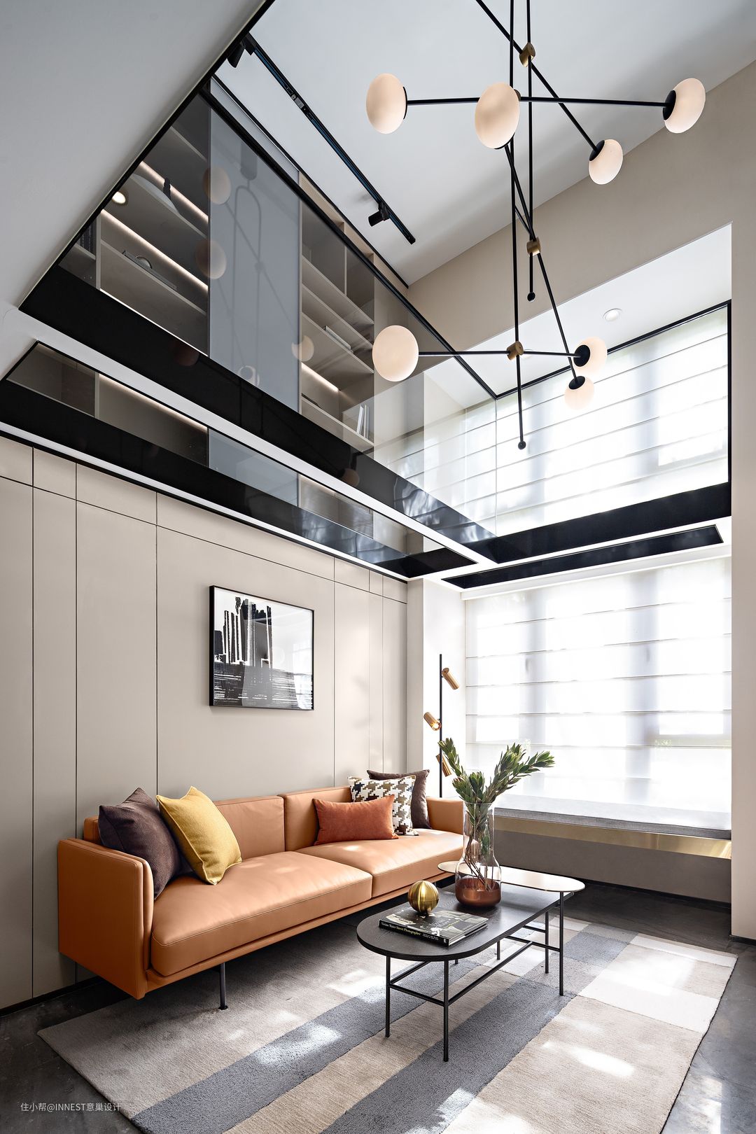 两层挑空让阳光更肆意,墙面设置镜面让空间视觉更加宽广明亮。