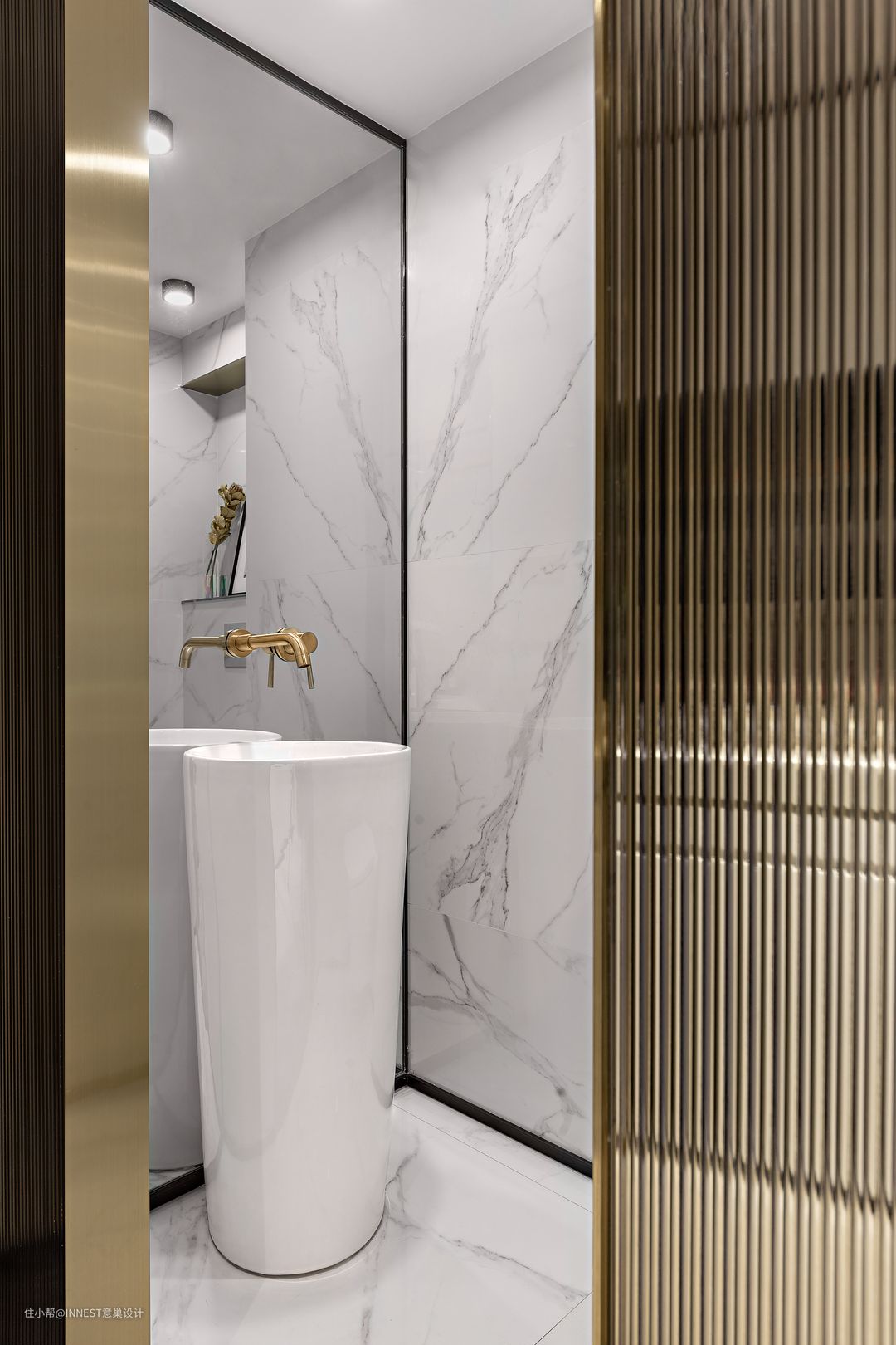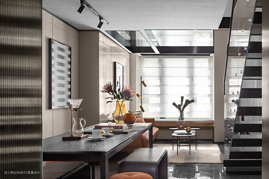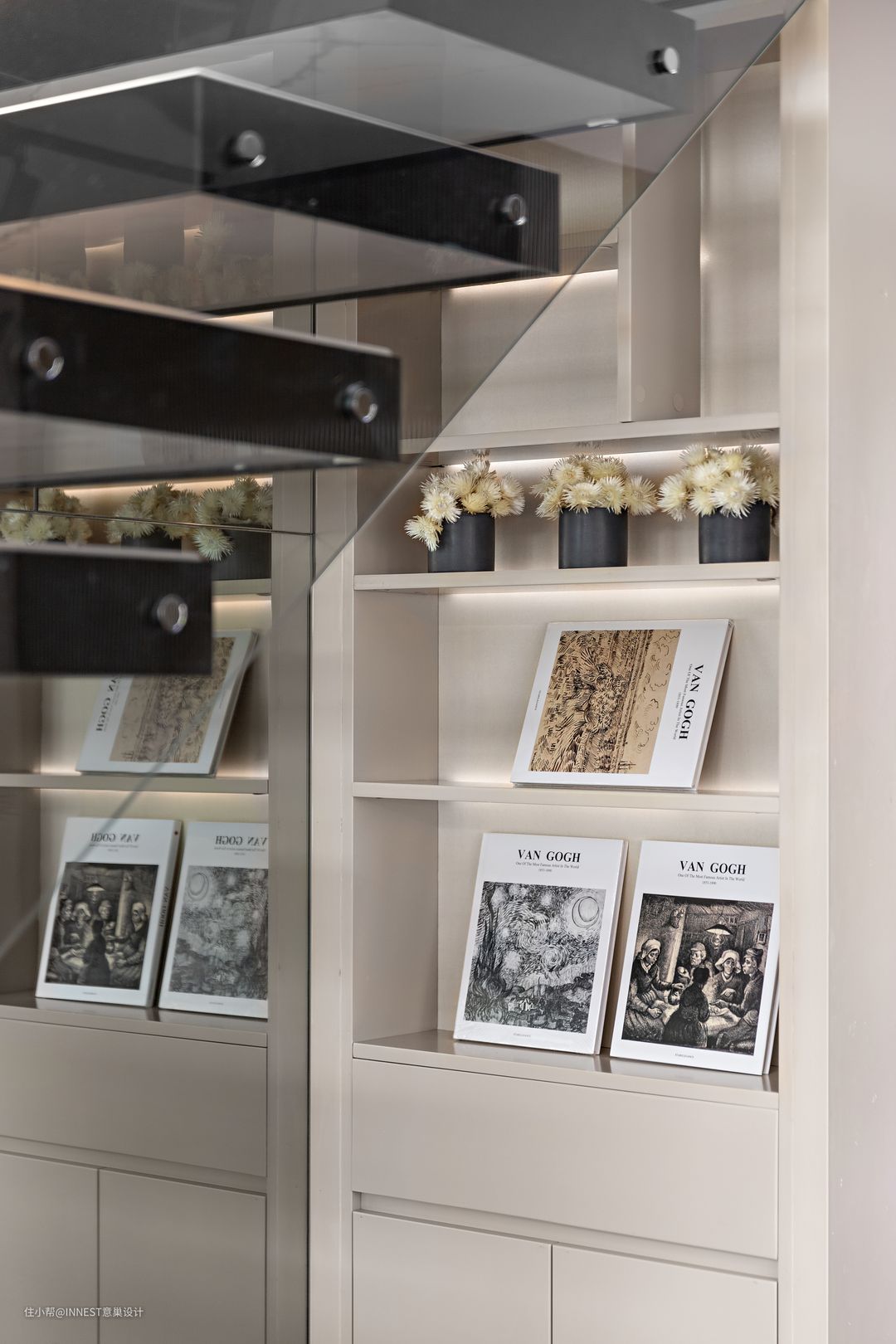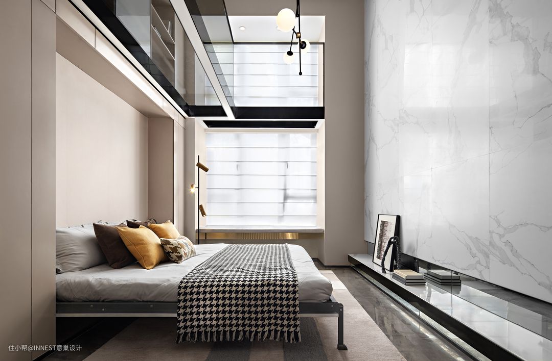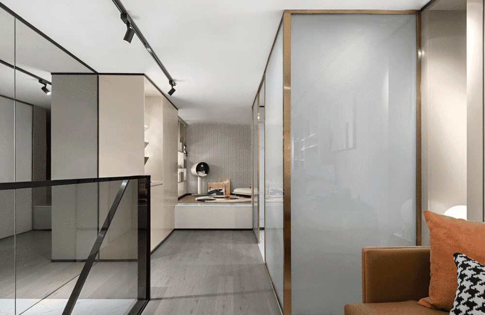 首先,我们在二层空间中运用了金属框架,金属框架中空的内部可通电线,直接将室内照明融合在整体框架中。二层在金属框架中的的洗浴间,运用了通电玻璃很好的在空间的通透感和私密性上做到一个平衡。中空的二层一条纵深的透明玻璃连廊贯穿起格局,增加了更多的收纳功能,在三维空间上最大程度地利用了空间,加强了人与人之间的粘合度。利用“可变空间”模式,将客厅变客卧,主卧变休息区等,为整个空间创造新的公共功能,重新激发区域活力。