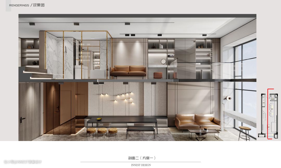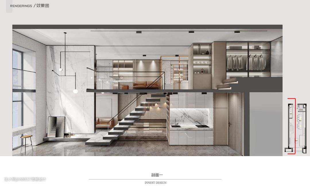 LOFT公寓内通过镶嵌在结构中的滑动门、橱柜、等结构,将室内空间重新划分。如墙壁尽可能多的做了隐蔽的收纳柜,在立面中消化了睡前醒后的基本生活需求,做到物各有位。面对入口处的空间,靠盥洗区的结构给餐厅区做视线遮挡,同时也将入口间隔开来,维持了住户的私密性。利用大量玻璃和镜面材质制造通透感和空间张力,使得空间连贯简明,同时增加节奏感。