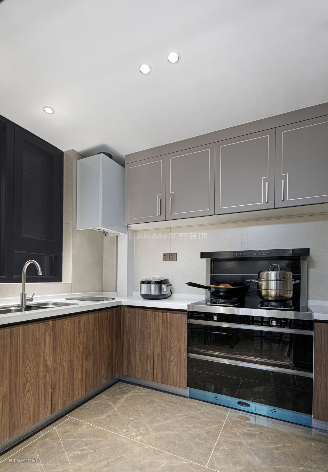 U型厨房符合烹饪流程,集成灶功能丰富,节省空间,利落整洁。灰色吊柜以金色线条增加细节美感,木色橱柜沉稳质朴,整体配置得丰富却不压抑。