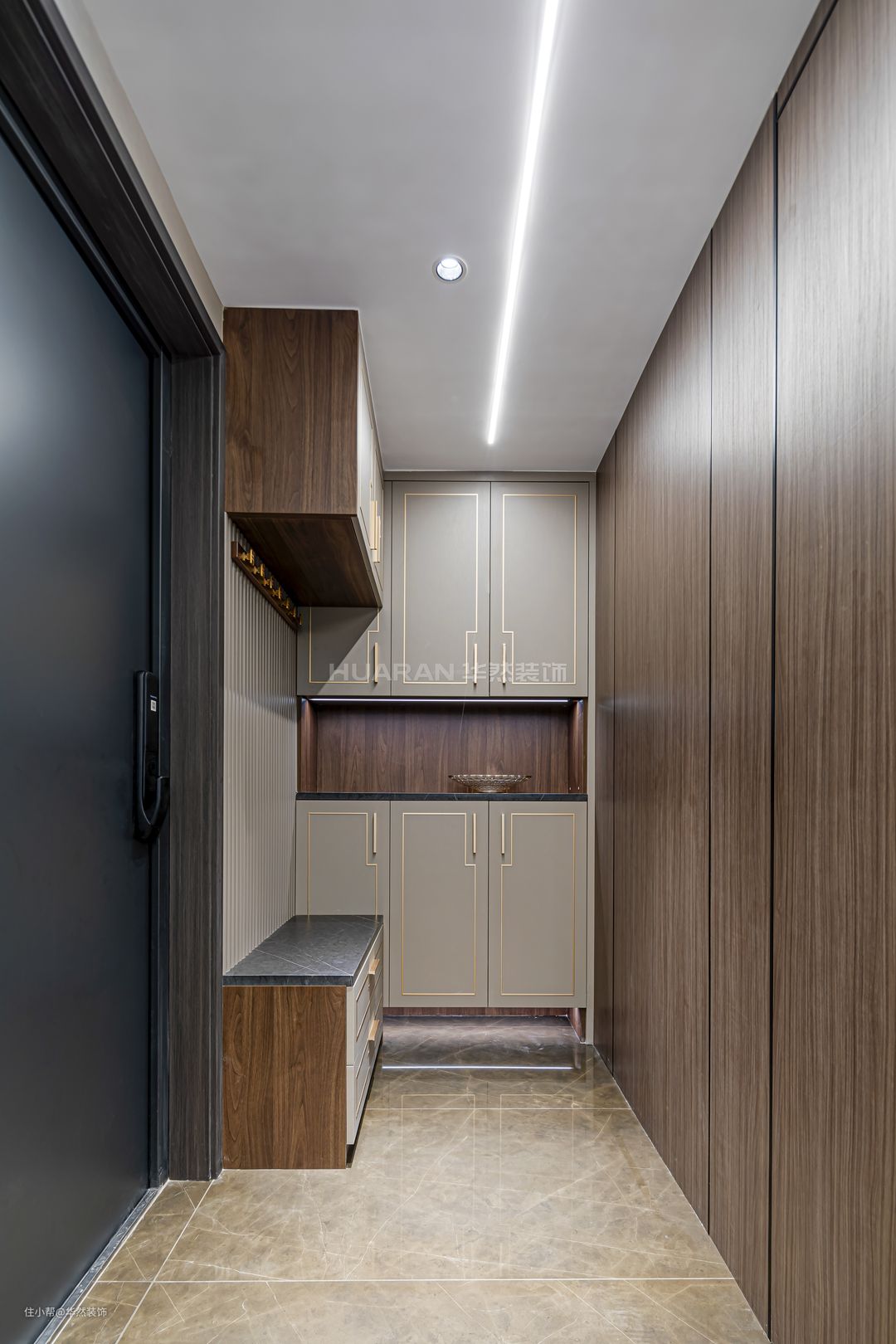 入户空间较为狭窄,以深色木饰面塑造出简约大气的环境。左方两侧墙面均设置了玄关柜,高低层次的格局脱离了沉重压抑感。线性灯延伸视野明亮处,筒灯照明入户换鞋区。