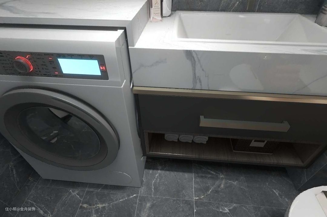 卫浴空间相对开阔一些,各功能区域齐全,沿墙面环绕排列,形成一个U字,预留了足够宽阔的活动空间。 浴室柜定制使用理石台面,连通洗衣机,增加卫生间浴室柜台面使用面积,不浪费区域。 深灰的瓷砖更易打理。