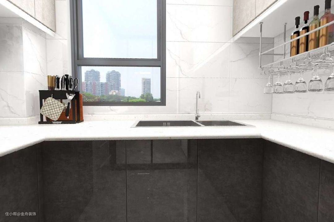 最终确定为封闭式厨房,U型厨房实用性更强,颜色选用黑色柜门颜色,上柜搭配浅色柜门互相搭配,整个空间更明亮。 选用集成灶,集成灶是下排烟,提升生活品质。