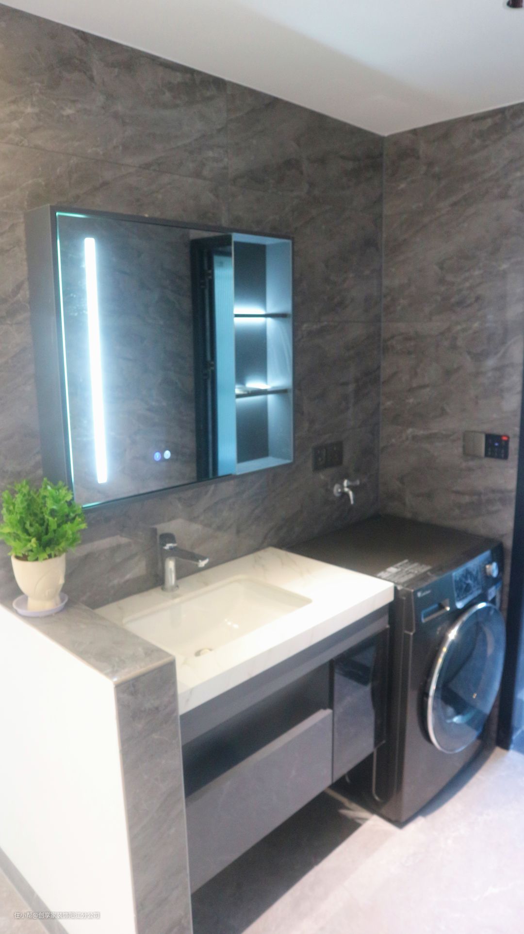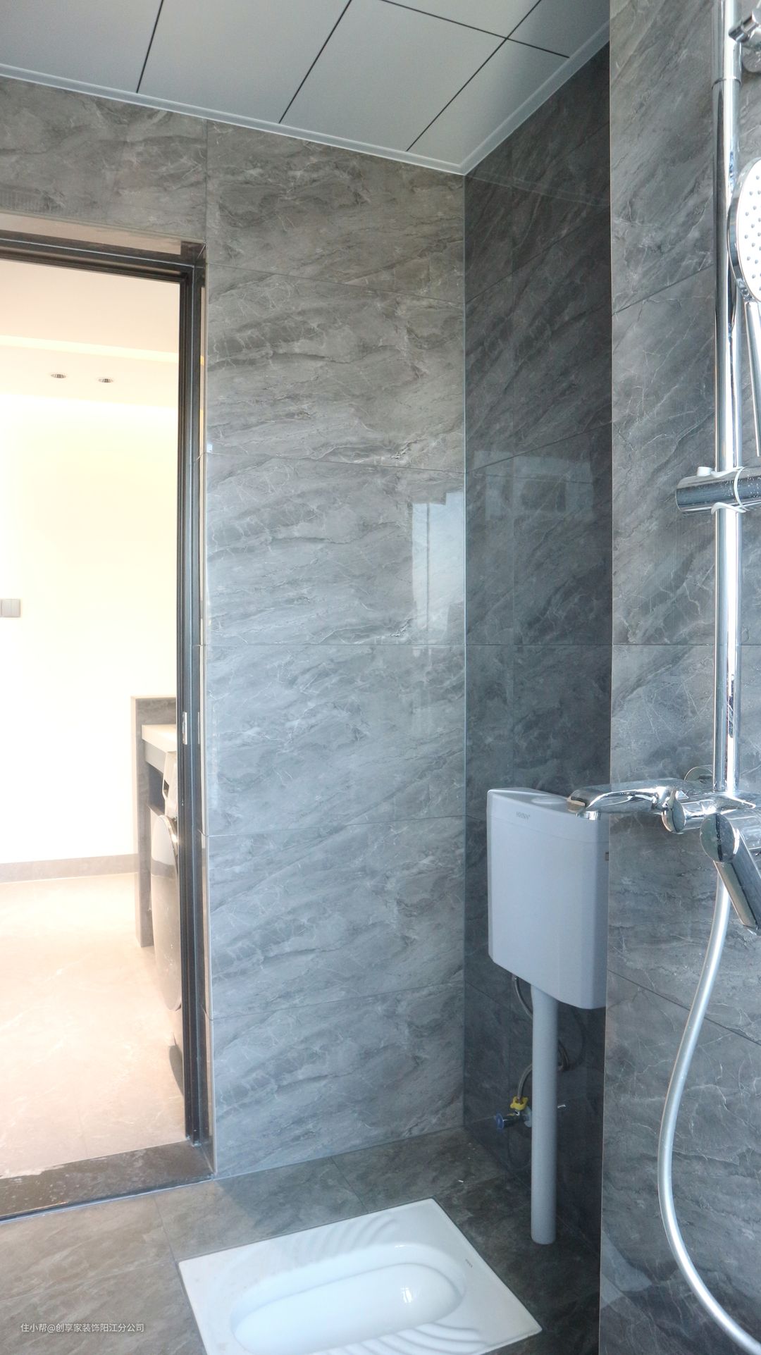 ● 卫生间做干湿分离,把洗手盆设计在厕所外边,方便多人使用;把干区的墙打掉一半,做半墙设计,让整个空间看起来更通透敞亮。