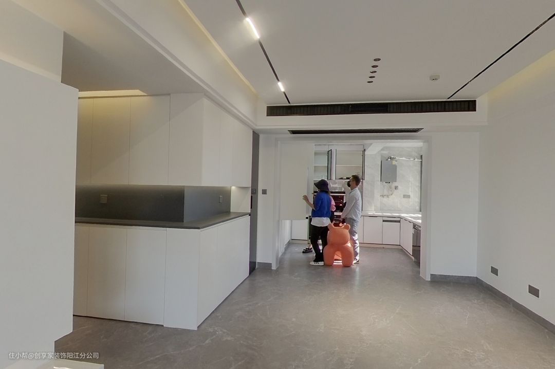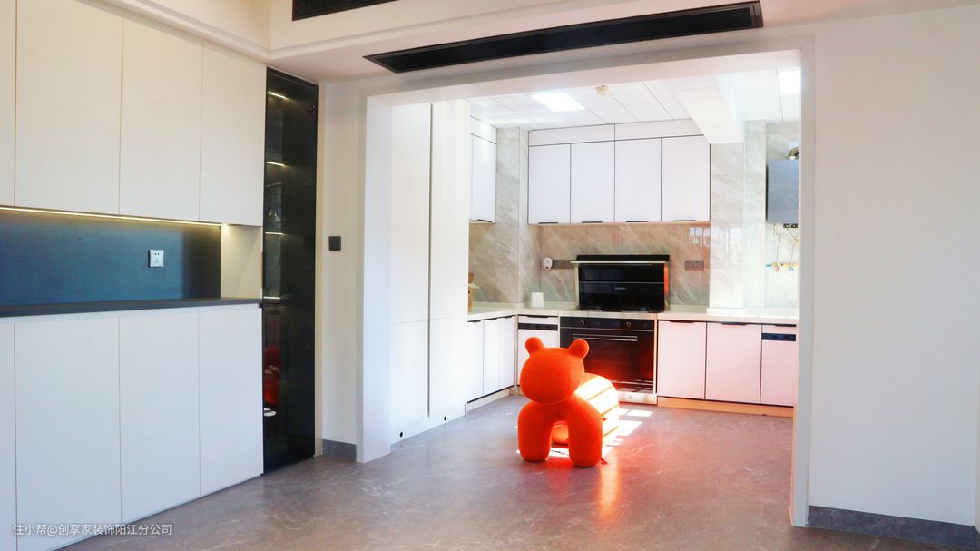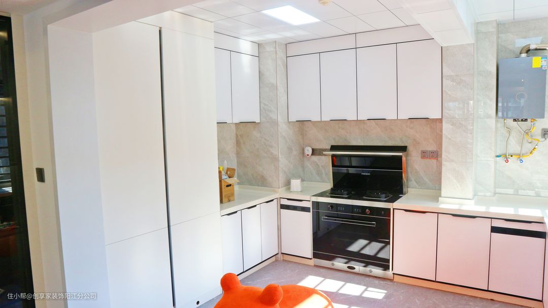 ● 业主暂定开放式厨房,便于家人间的交流与沟通,增加和睦气氛。 ● 纯白色的烤漆橱柜和灰色纹理墙砖搭配,提高了从客厅到厨房线性的整体和谐度,还很温馨明亮;