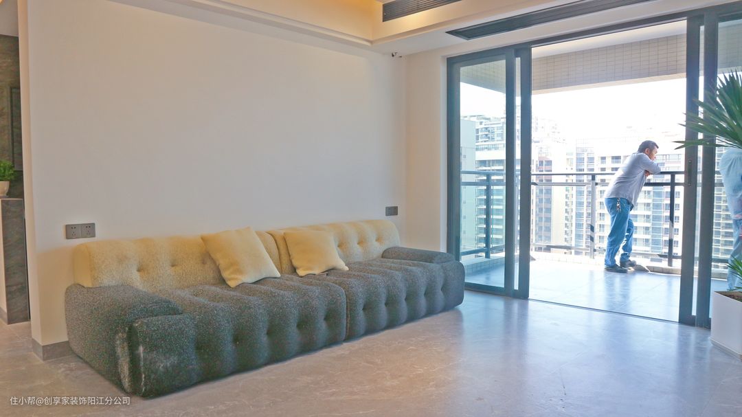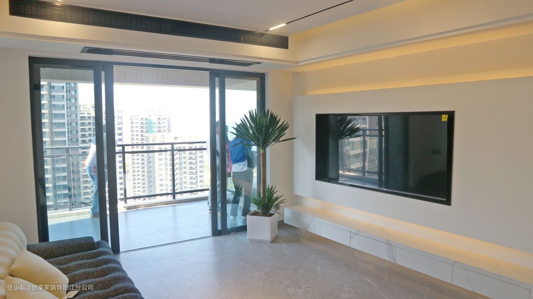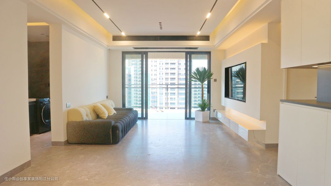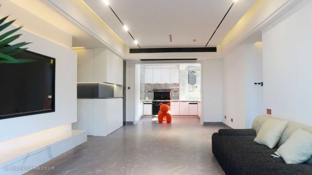● 客厅给人的感觉简约大气,墙体刷乳白色乳胶漆,搭配哑光燕麦色地板,整体通透明亮; ● 吊顶做悬浮吊顶,四周做简单的双眼皮吊顶,因为要嵌入空调,所以尺寸保留大约35公分左右;