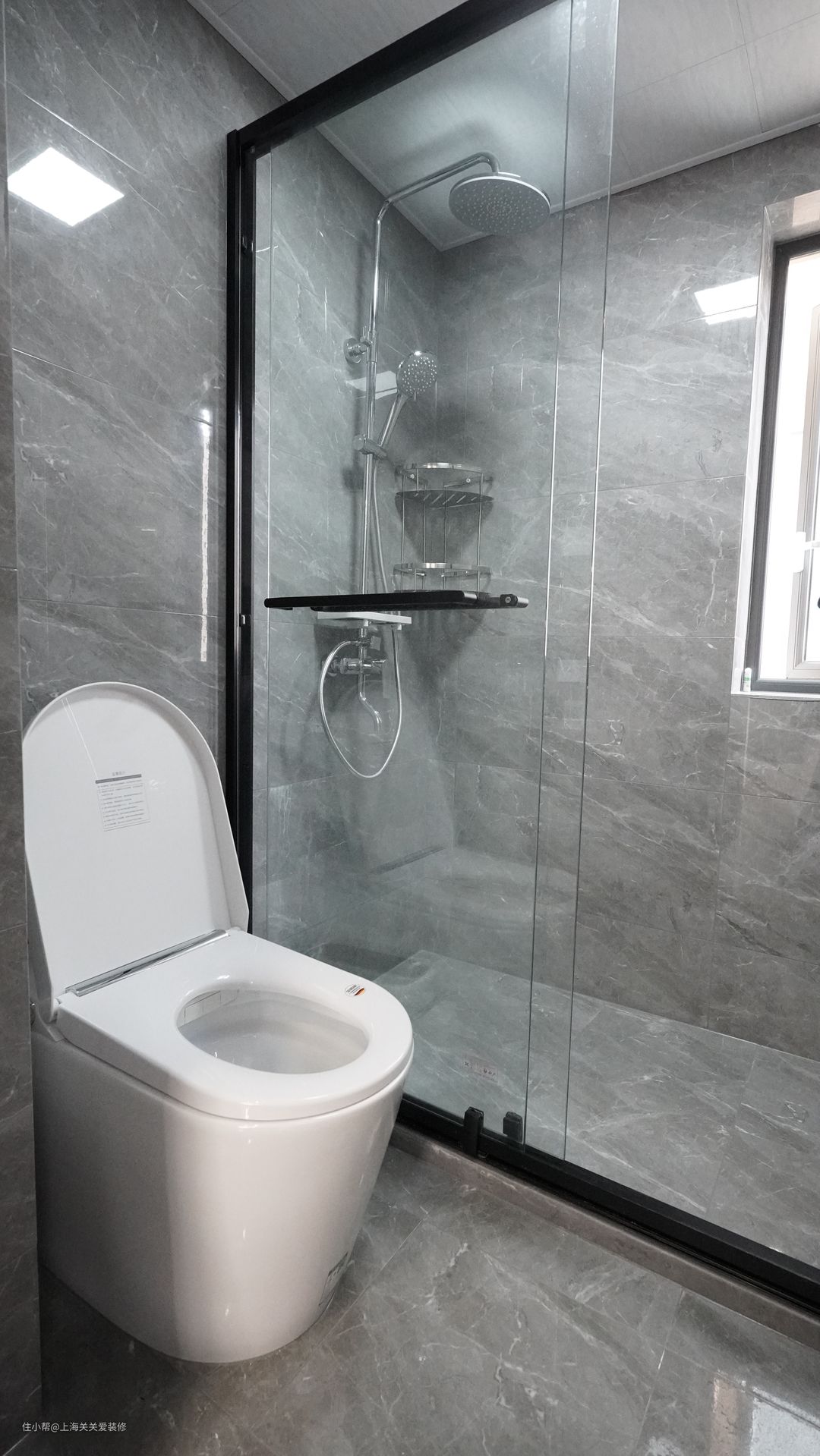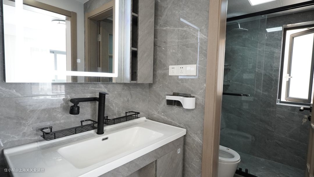 恒温花洒搭配置物架,浴室与马桶用透明玻璃门隔离,可以隔绝雾气,整体灰色大理石纹通铺,增加空间感。