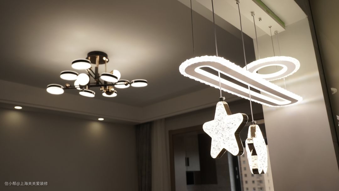客厅选择的三色带遥控的主灯,不同角度看都有不同的形状,充满意境非常有趣有魅力,吊灯选用环形星星灯,灯光可以切换白光、暖光、中性光,时尚简约轻奢大气。