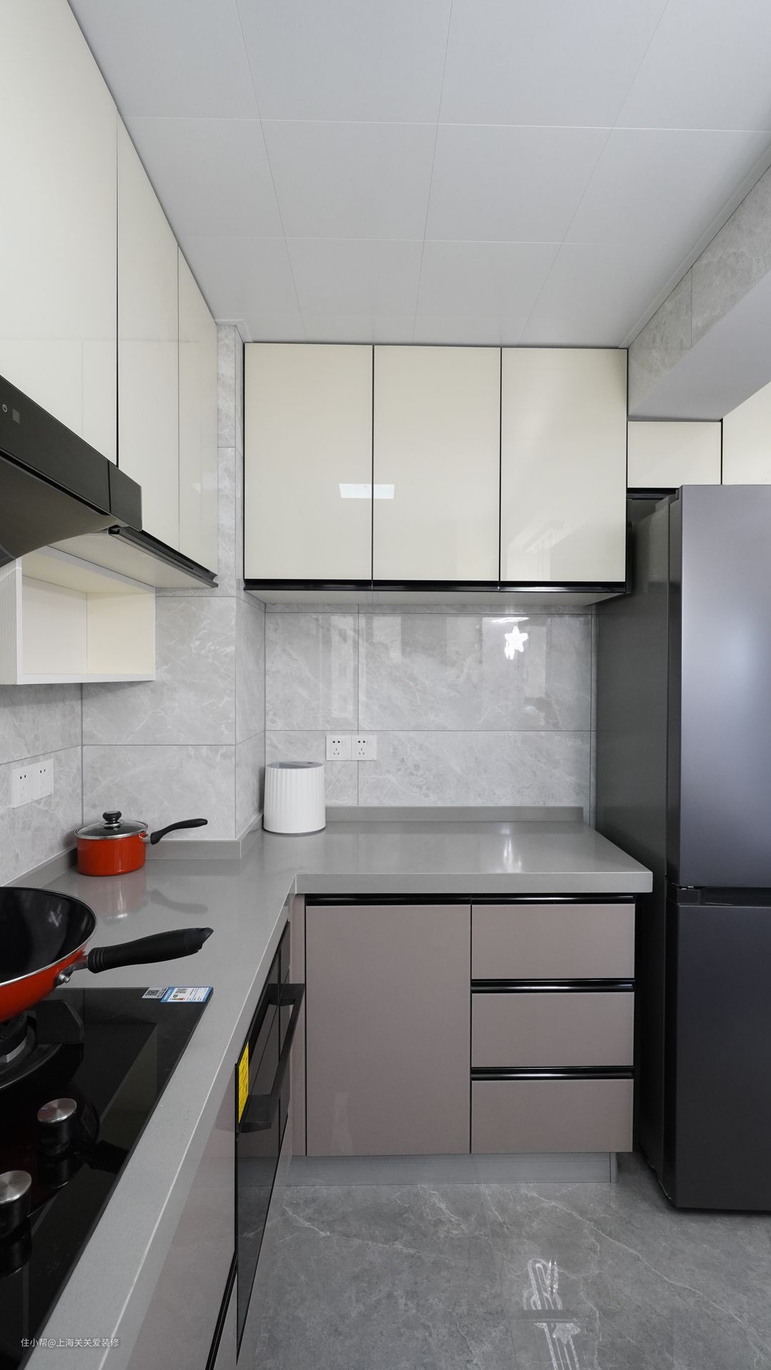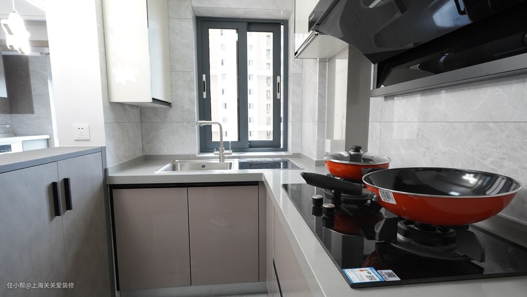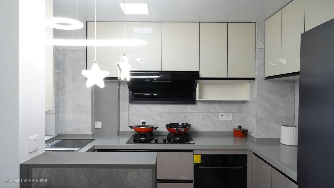 厨房收纳柜除了封闭式还做了一些抽屉类的橱柜,插座在操作台上20公分处,数量足够,平时充电开关都非常方便,墙上设计了置物格,方便放一些调味品等。