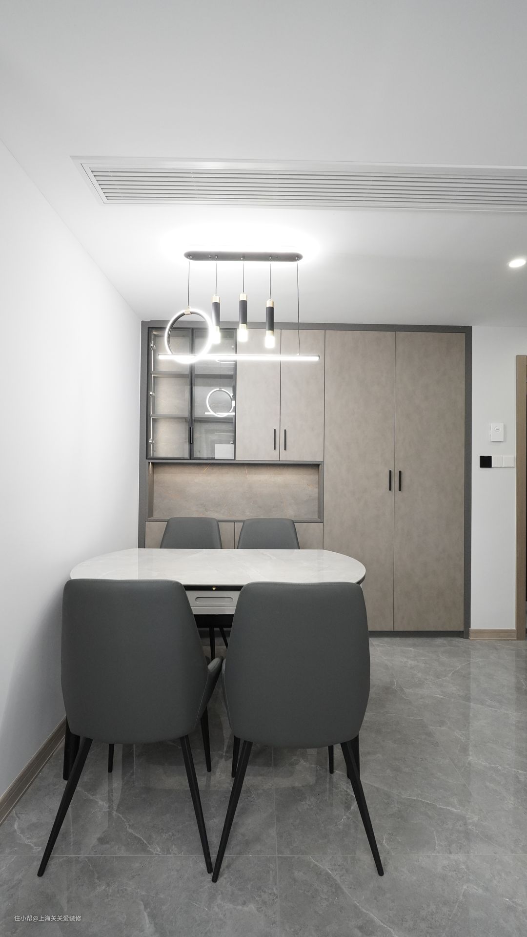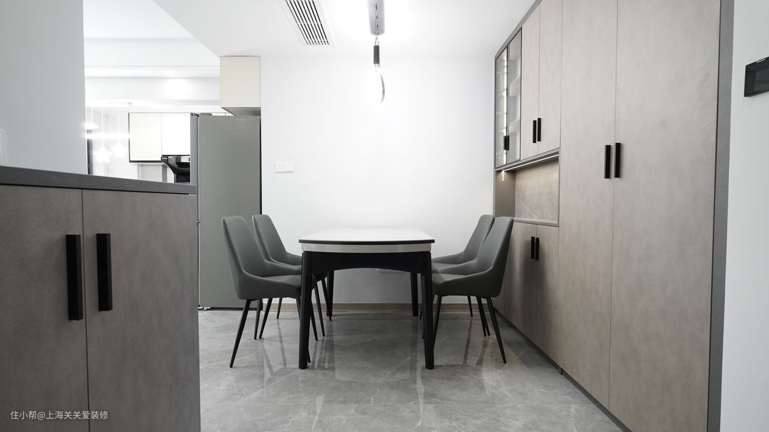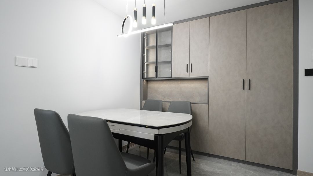 开放式餐厅背景选用严丝合缝的整墙背景柜,有效利用存储收纳空间。岩板餐桌也是可伸缩折叠的,方圆两用桌面,日常方桌用餐节省空间,聚会时展开就是圆桌非常适合亲友聚会。