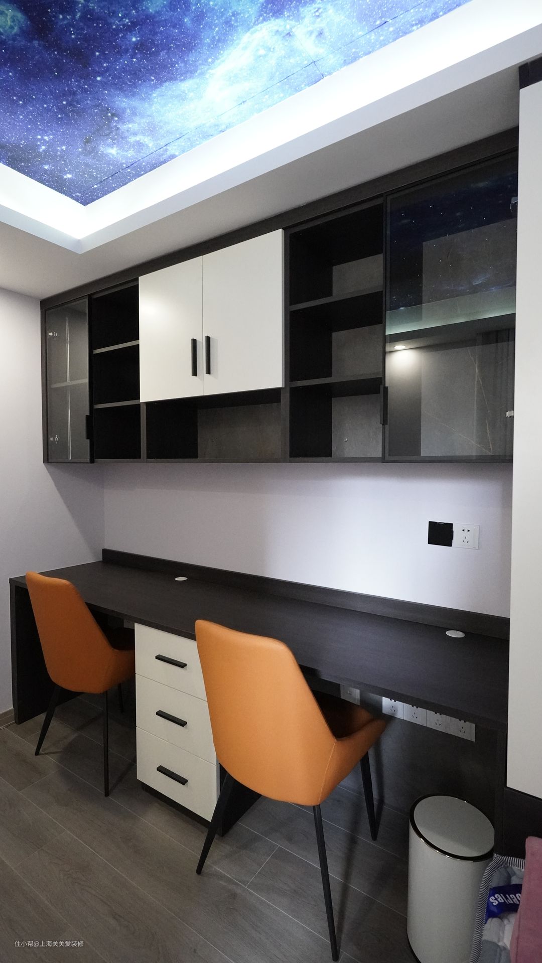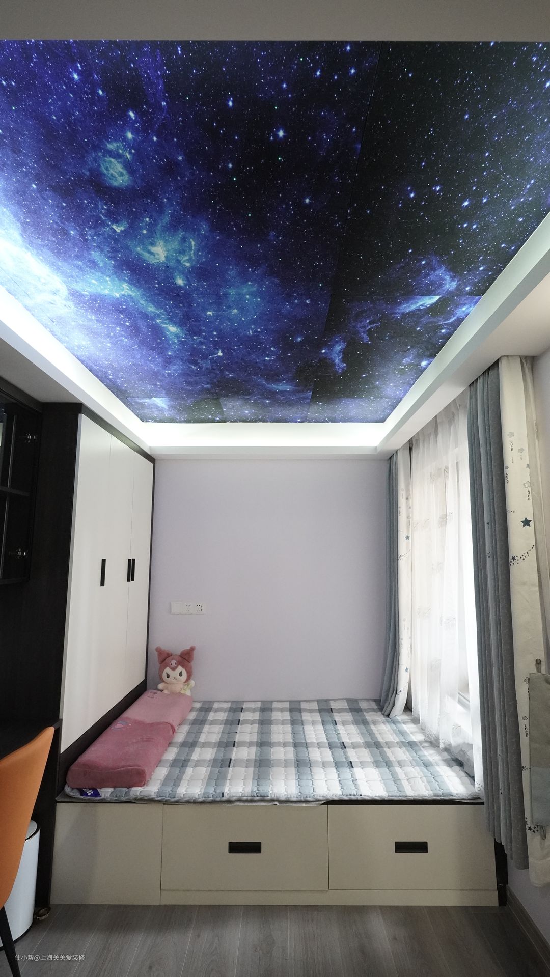 电竞房是一间科技感满满的房间,夫妻俩下班可以一起组队开黑,充满生活乐趣,星空顶灯光为次卧增加了时尚浪漫的氛围。