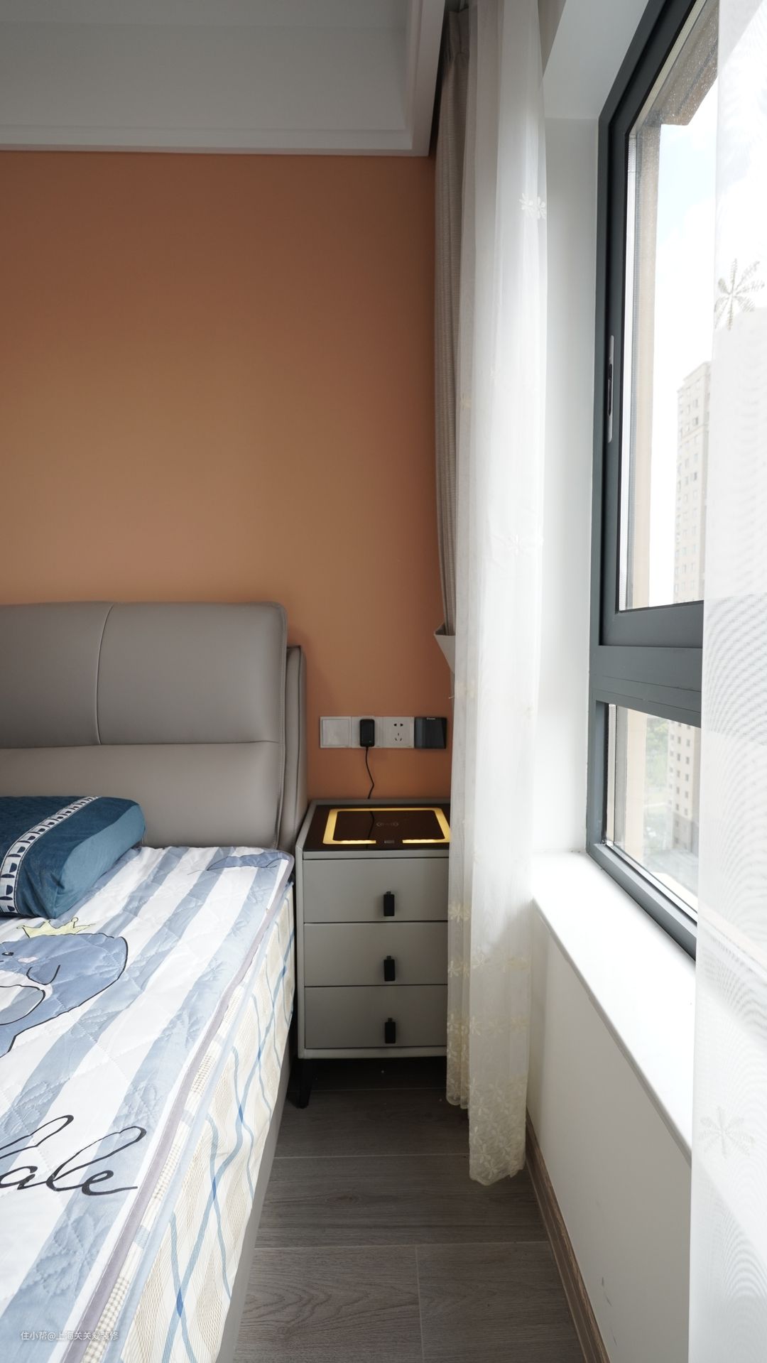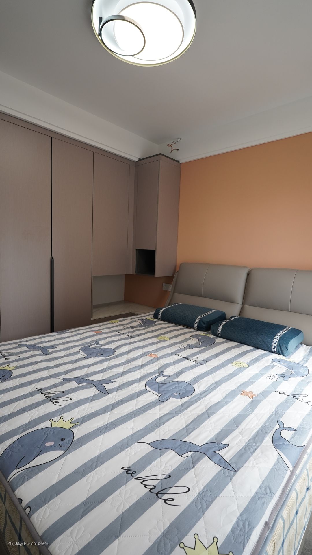 主卧延续现代轻奢的风格,灰色调床铺与衣柜视觉和谐一致,更与橙色乳胶漆背景墙撞色,非常时尚,增加休息空间温馨柔和的内涵。