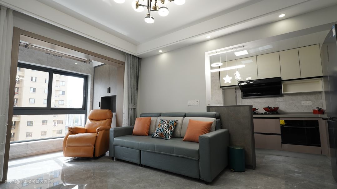 客厅以简约灰色为整体基调,地砖通铺,与开放式阳台一体,整体采光很好,打造明亮开阔的空间感,配合雾霾蓝可折叠多功能沙发,让小户型也能灵活储物,多功能实用性强。