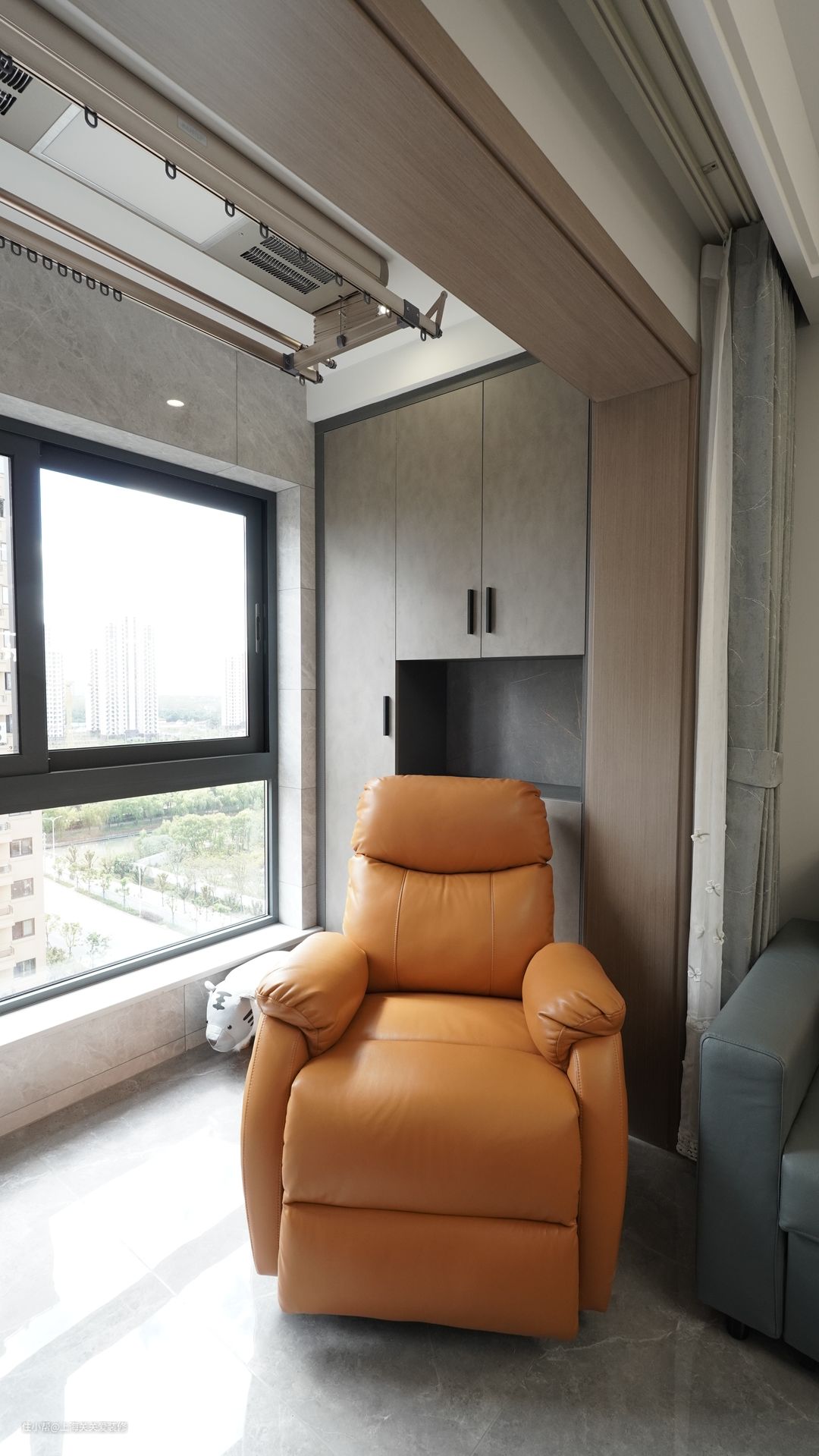 阳台另一侧也定制整墙到顶式储物柜,增加收纳空间。