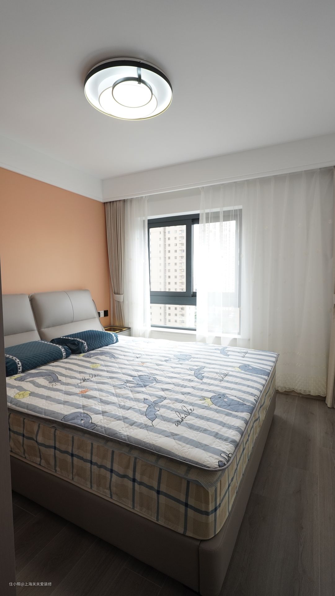卧室整体平铺浅色木地板,配合白色窗纱更显明亮,卧室选用简约吸顶灯,金色点缀专色设计,随心调节色温和亮度,满满的时尚感。
