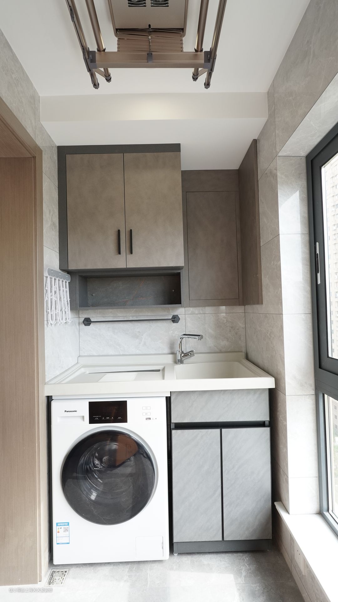 阳台左右空间都有效利用,阳台放置洗衣机,上方做洗水池,方便日常浣洗,其余空间利用起来做储物柜,增加收纳空间。