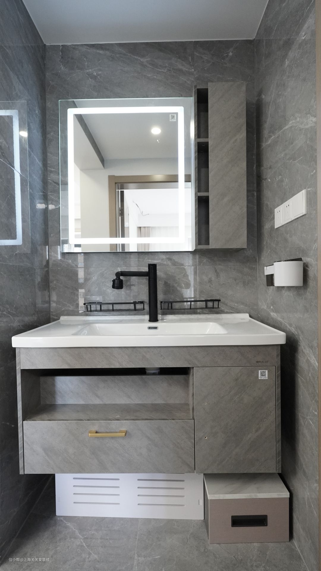 定制悬空洗漱台,实用颜值高,一体化设计整体明亮,洗手台下方留25厘米用来储物,可以多功能收纳。